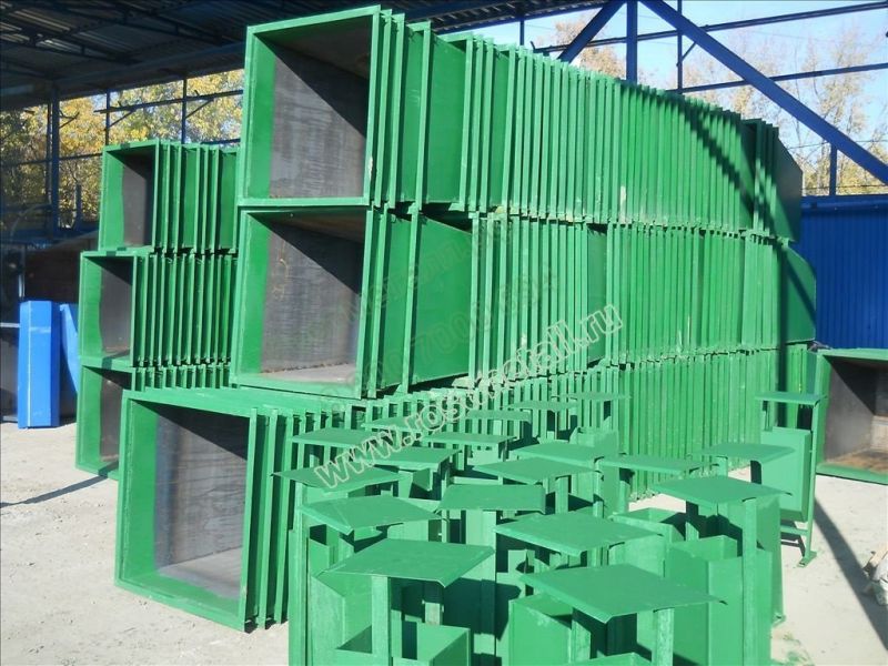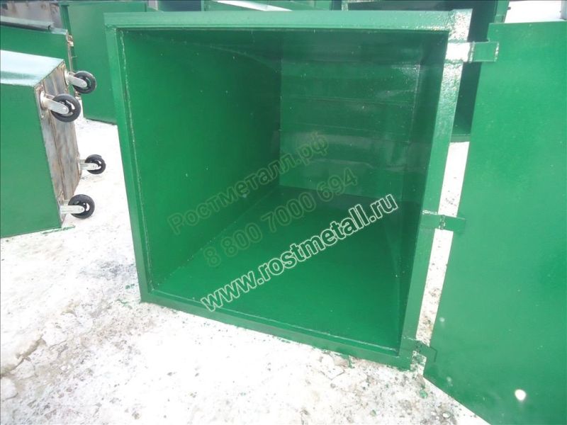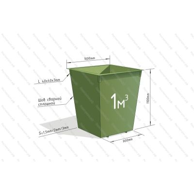 Контейнер сваривается из стальных листов марки СТ3 толщиной от 1,5 мм до 3 мм. Мусорный бак обваривается сплошным швом и имеет цельную жесткую конструкцию. Обрамление контейнера по верхнему краю — уголок 40х40 мм. Ребра жесткости также имеют усиление длиной 100 мм из уголка 40х40 мм. В основании контейнера приварены ножки из уголка 40х40 мм. Контейнер стандартно окрашен в зеленый цвет и внутри окраска занимает не более 150 мм.