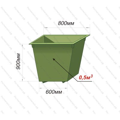 Контейнер сваривается из стальных листов марки СТ3 толщиной от 1,5 мм до 3 мм. Мусорный бак обваривается сплошным швом и имеет цельную жесткую конструкцию. Обрамление контейнера по верхнему краю — уголок 40х40 мм. Ребра жесткости также имеют усиление длиной 70 мм из уголка 40х40 мм. В основании контейнера приварены ножки из уголка 40х40 мм. Контейнер стандартно окрашен в зеленый цвет и внутри окраска занимает не более 150 мм.
