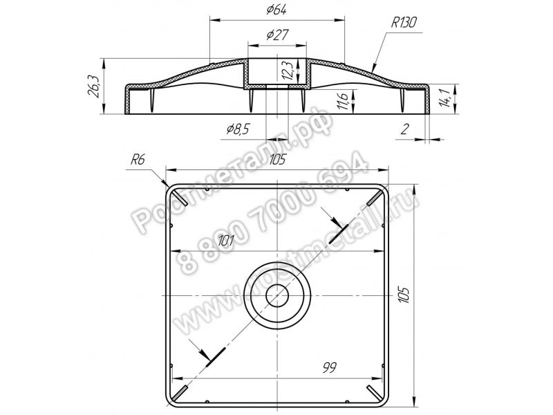 Для защиты верхнего торца столба от воздействия влаги УФ-излучения мы производим крышки размерами 100*100