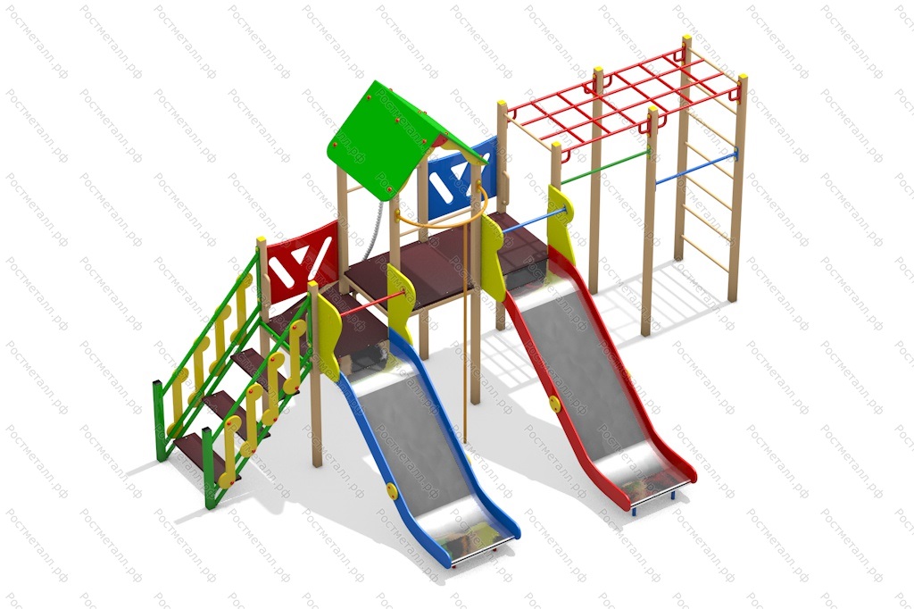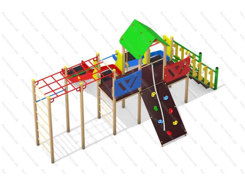 | Комплектация | 2 башни, 2 горки скат нерж., шест, скаладром с канатом, лестница подъемная, 2 турника, рукоход-сетка. |
