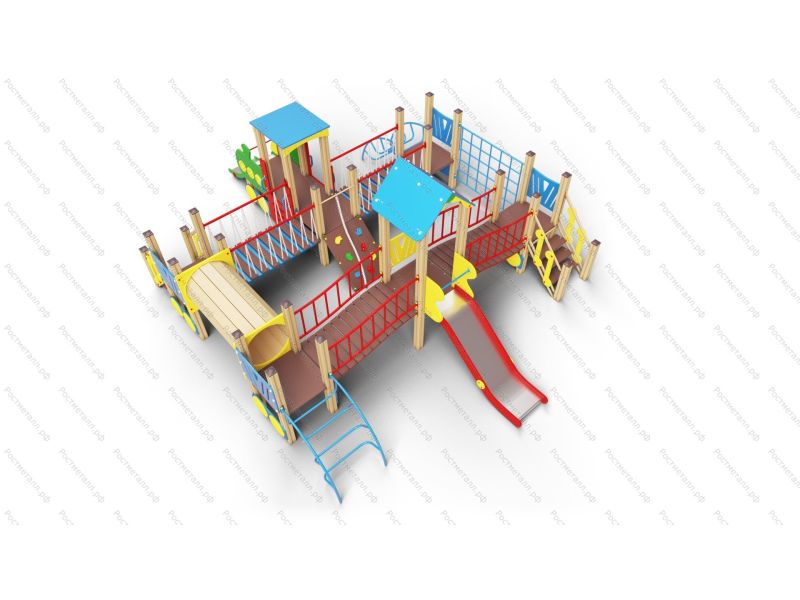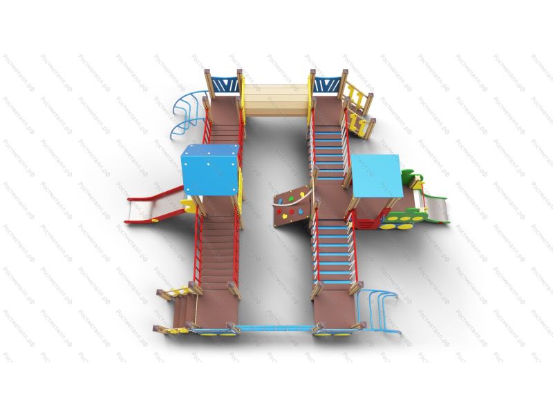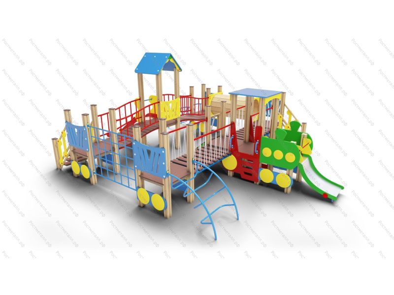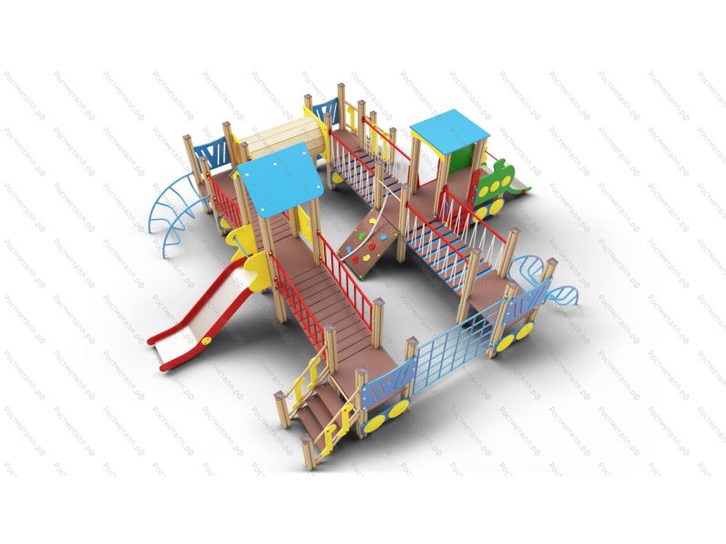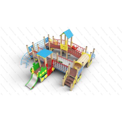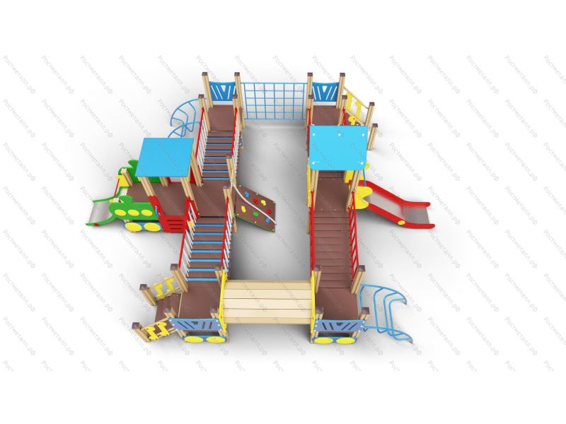 | Комплектация | 5 башен стандарт, башня с паровозиком, 2 горки-ската из нерж. стали, 2 подъёмные лестницы, труба-тоннель переход, 2 лаза-дуги, скаладром с канатом, лаз-сетка, мостики: 2 подвесных и 2 изогнутых; 2 подъёма. |