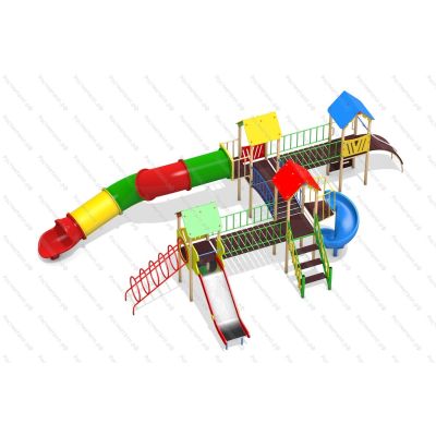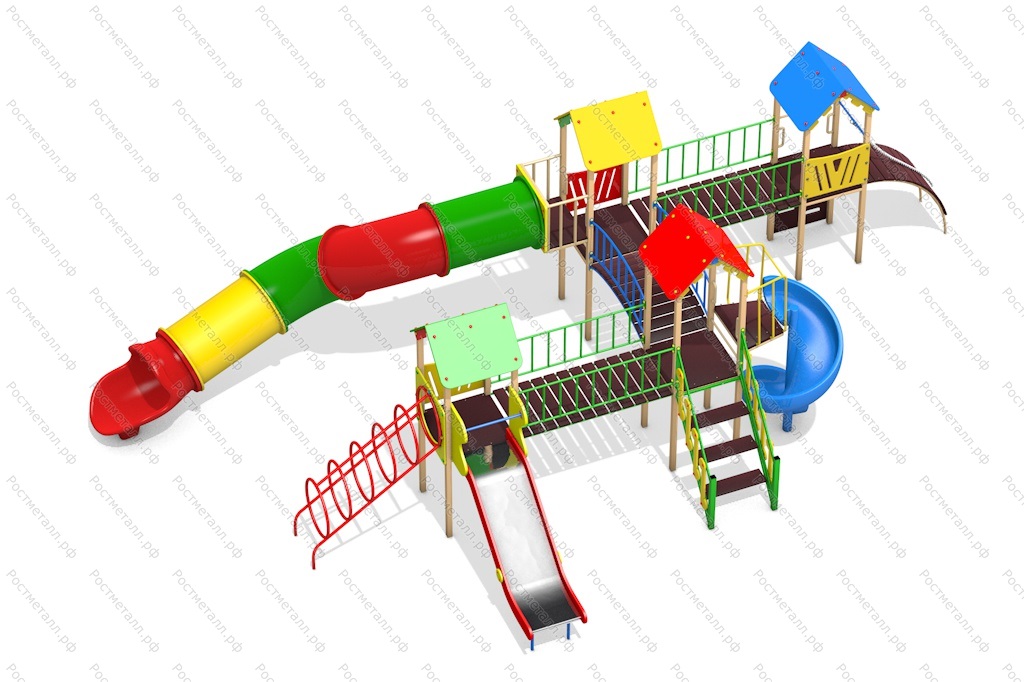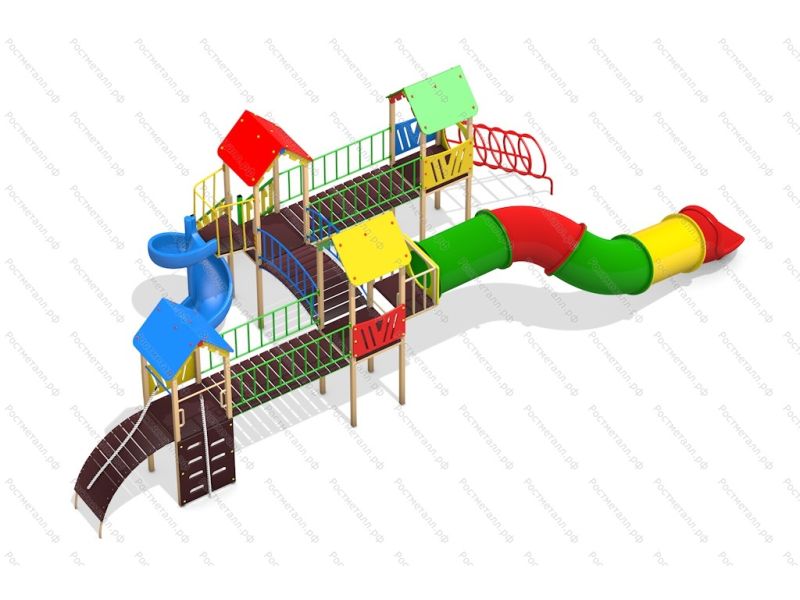 | Комплектация | 2 башни стандарт, 2 башни с балконом, 2 мостика прямых, мостик арочный, винтовая горка, лаз тоннель, лестница подъемная, горка тоннельная, подъём полукруглый с канатом, подъём с канатом стандарт. |