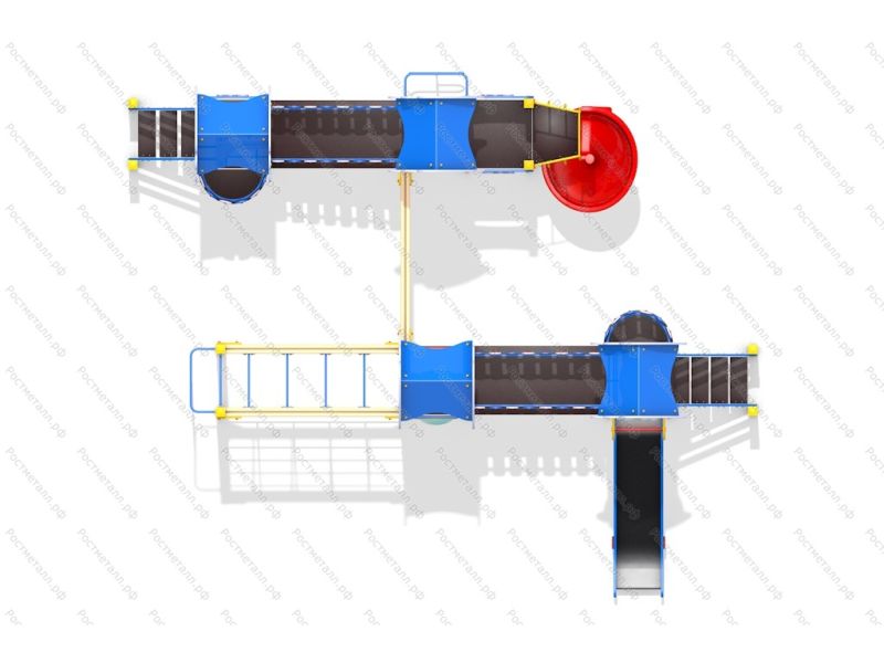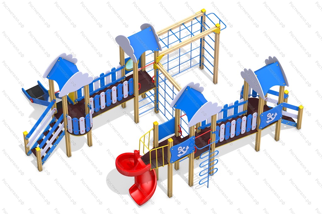 Комплектация 2 башни стандарт, 2 башни с балконом, винтовая горка из пластика, подъёмная лестница - 2 шт, шест змейка, пожарный шест, рукоход, шведская стенка, горка-скат из нерж. стали, 2 лаза сетки-перехода.
