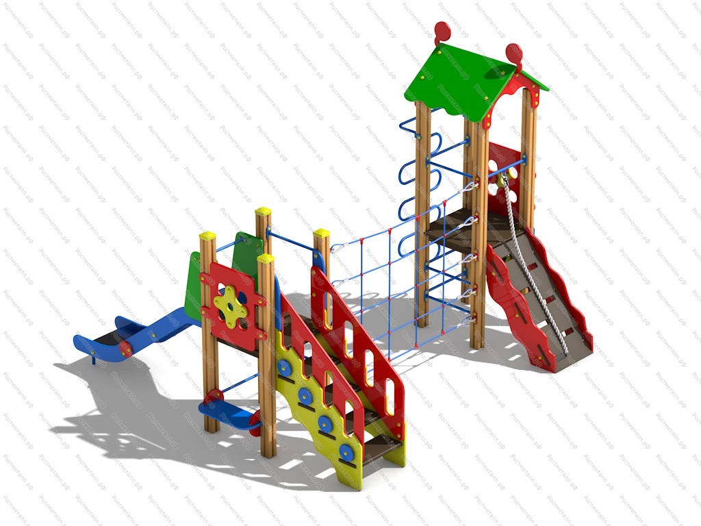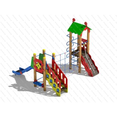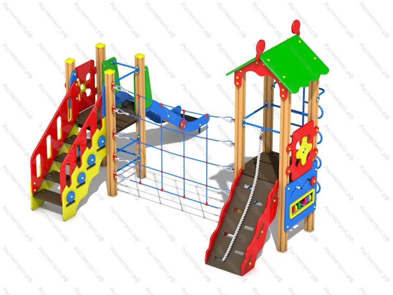 | Комплектация | 2 башни, 1 скат, 1 подъёмная лестница, 1 подъём с канатом, шест-змейка, лаз сетка-переход, детская лавка. |
