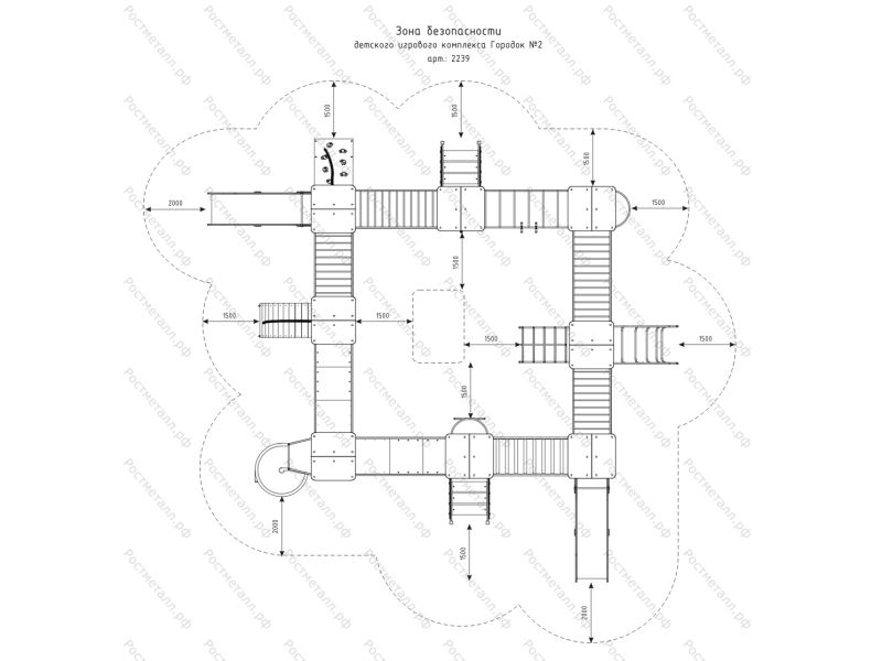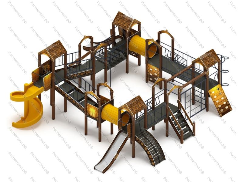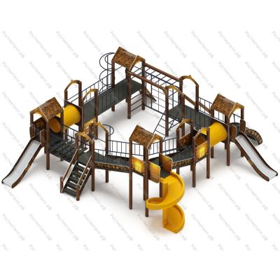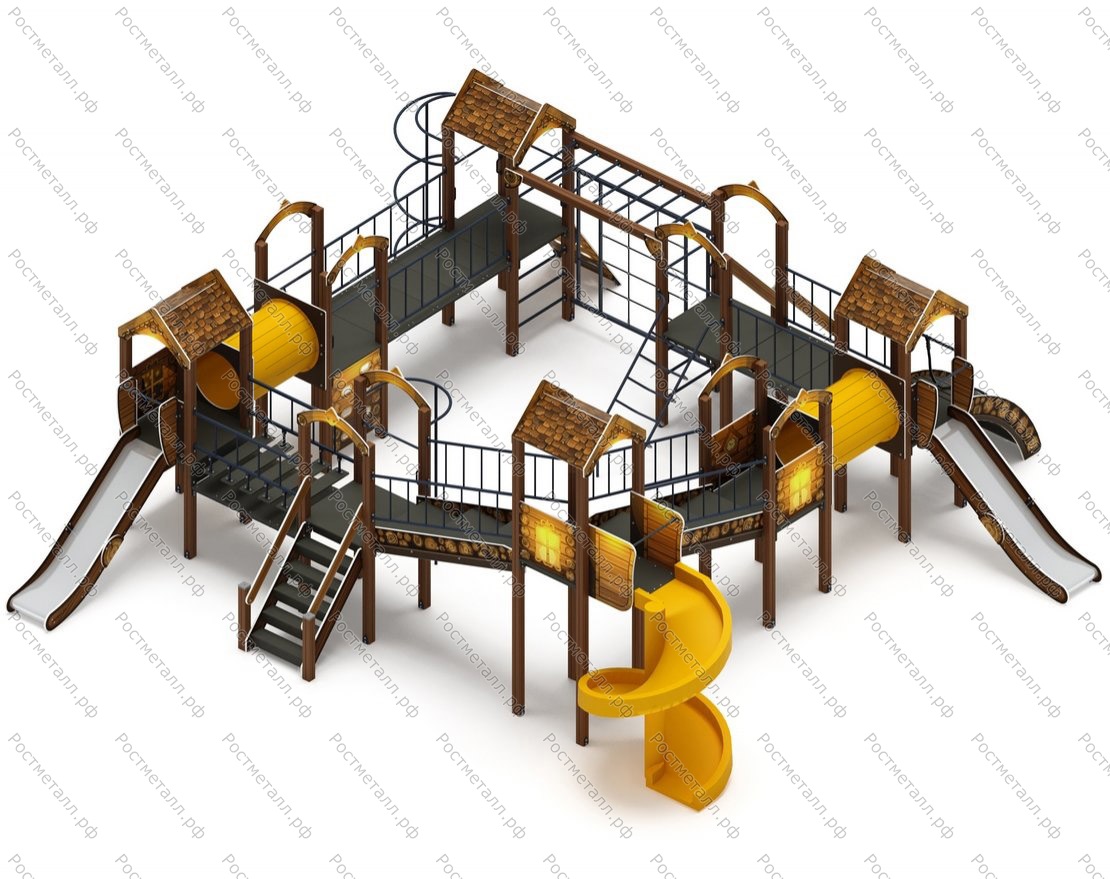 Комплектация 7 башен, башня с балконом, 2 ската из нержавеющей стали, винтовая горка, 3 прямых мостика, 2 мостика-лестница, 1 мостик переход, 2 круглых перехода, 1 лаз, 1 подъёмник с канатом, рукоход, шведская стенка, 2 лаз прямы, шест и шест змейка.