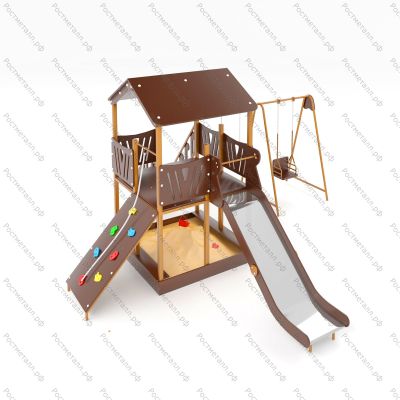 | Комплектация | Башня, горка-скат из нержавеющей стали, скаладром с канатом, лестница подъёмная, песочница, кольца гимнастическая, качели. |