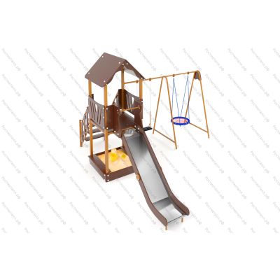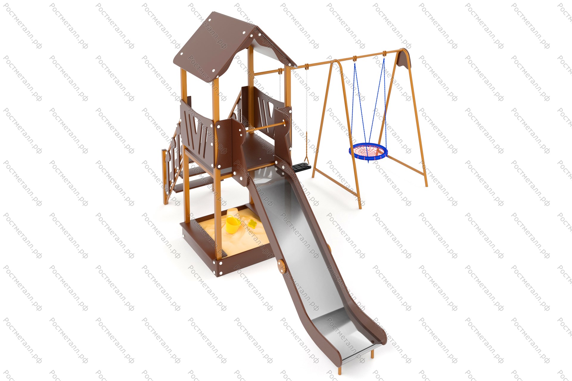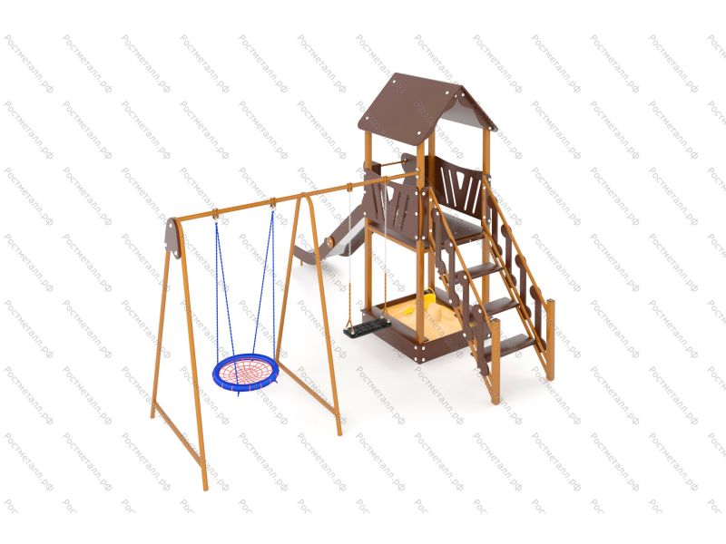 | Комплектация | Башня с песочницей, горка-скат из нерж.стали, подъёмная лестница, качели без спинки, качели Гнездо. |