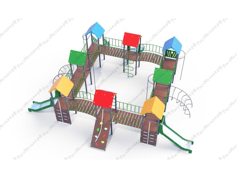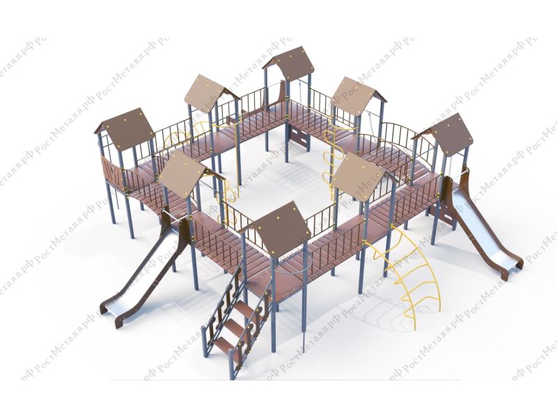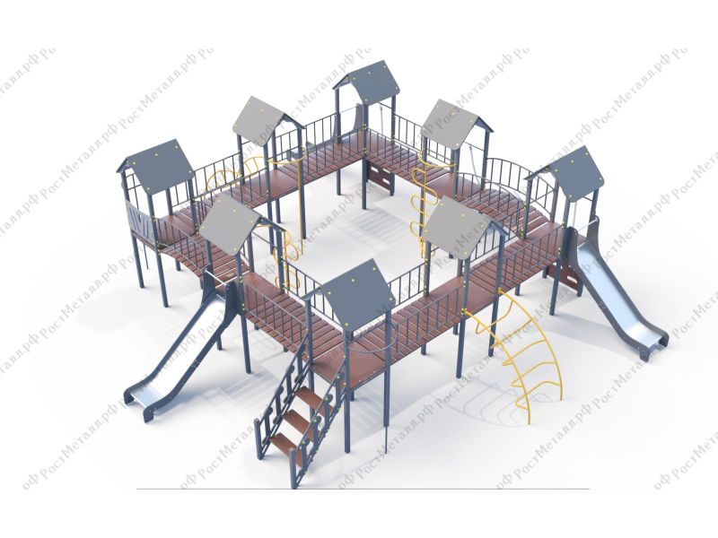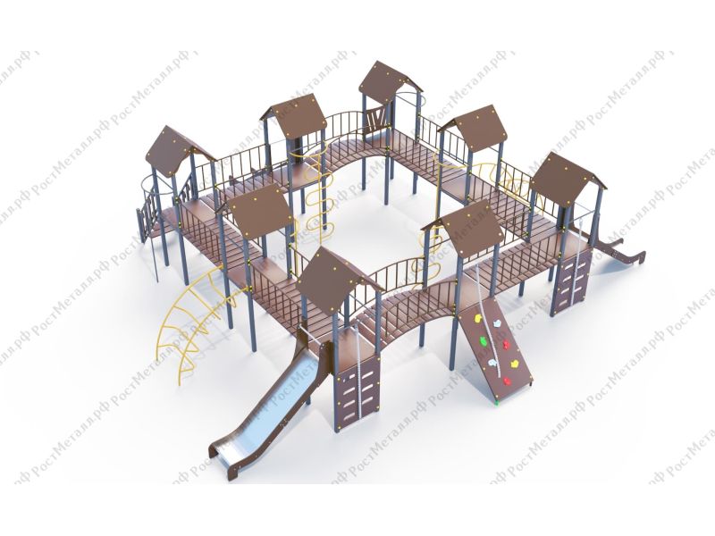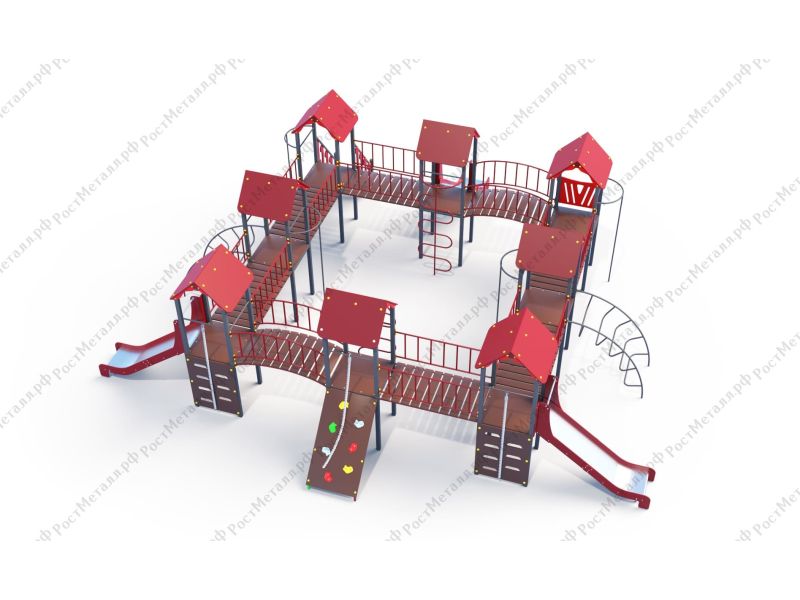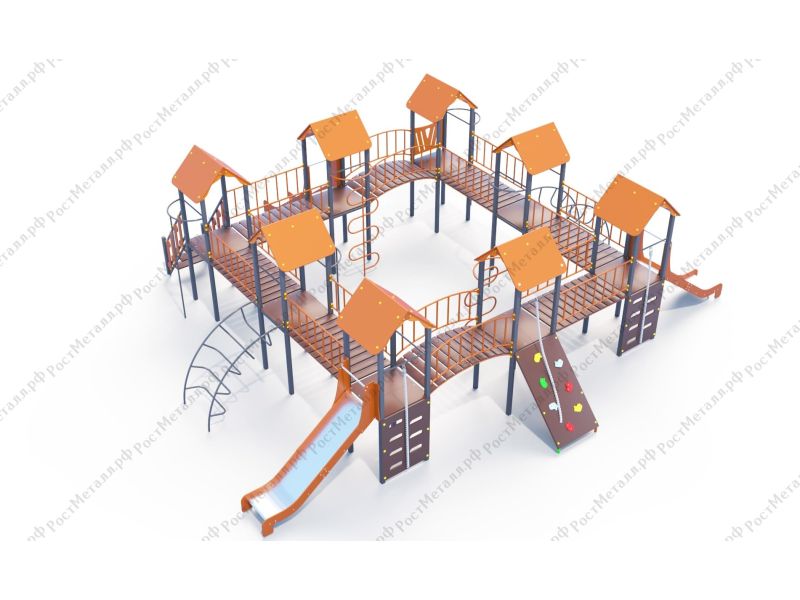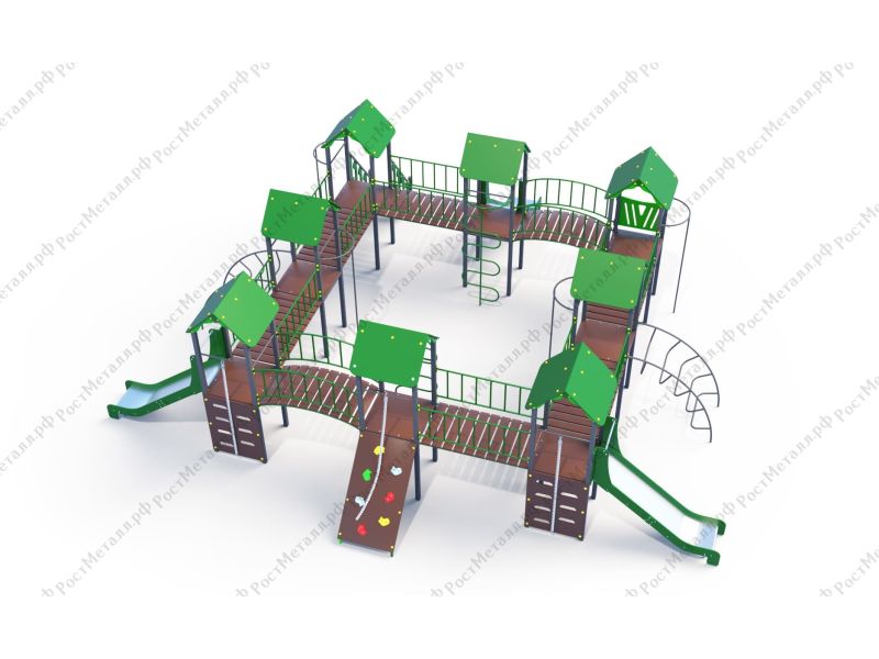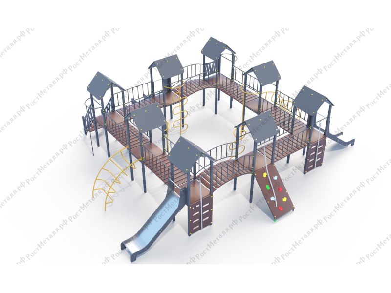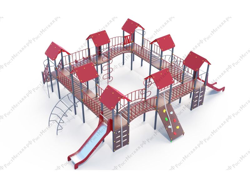 | Комплектация | 8 башен, 3 ската из нержавеющей стали, 2 лаза дуговых, 2 лестницы подъёмные, 2 качели одинарные, 2 шеста - змейки, конструкция соединена между собой мостиками-переходами прямыми и дугой. |