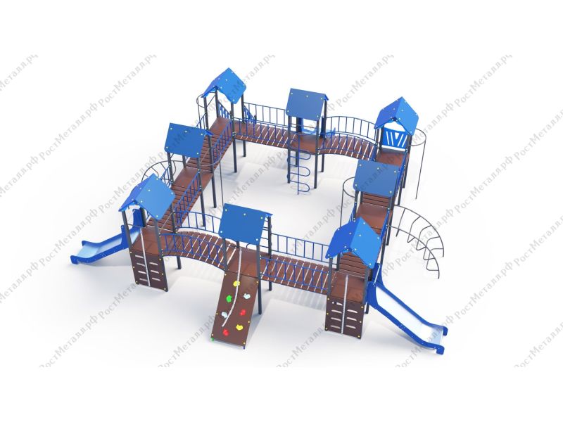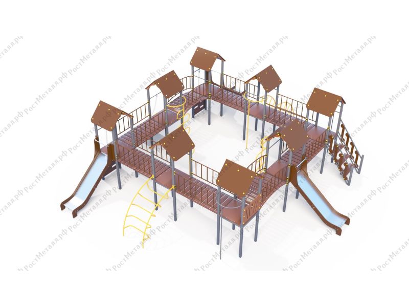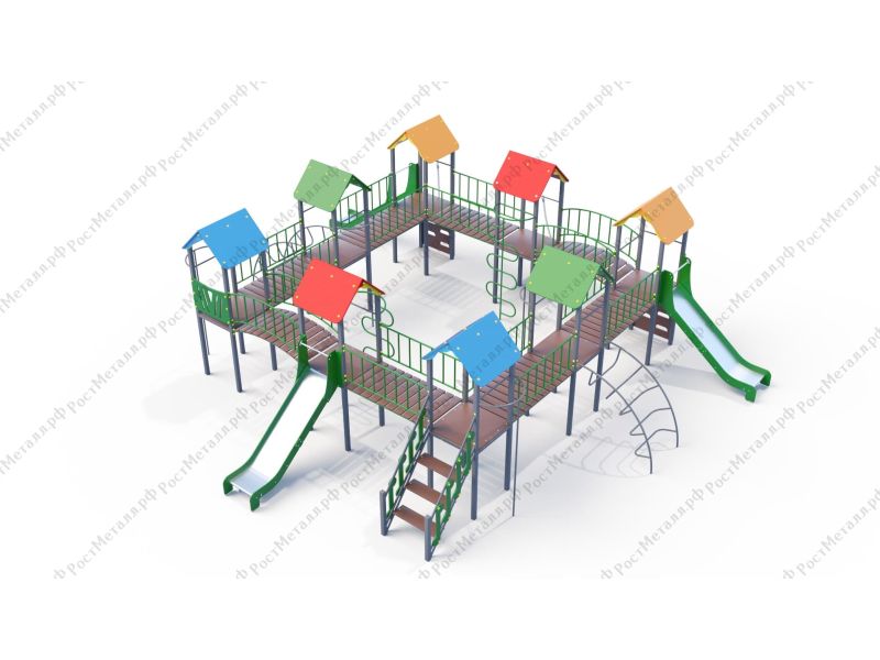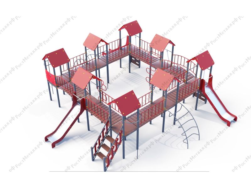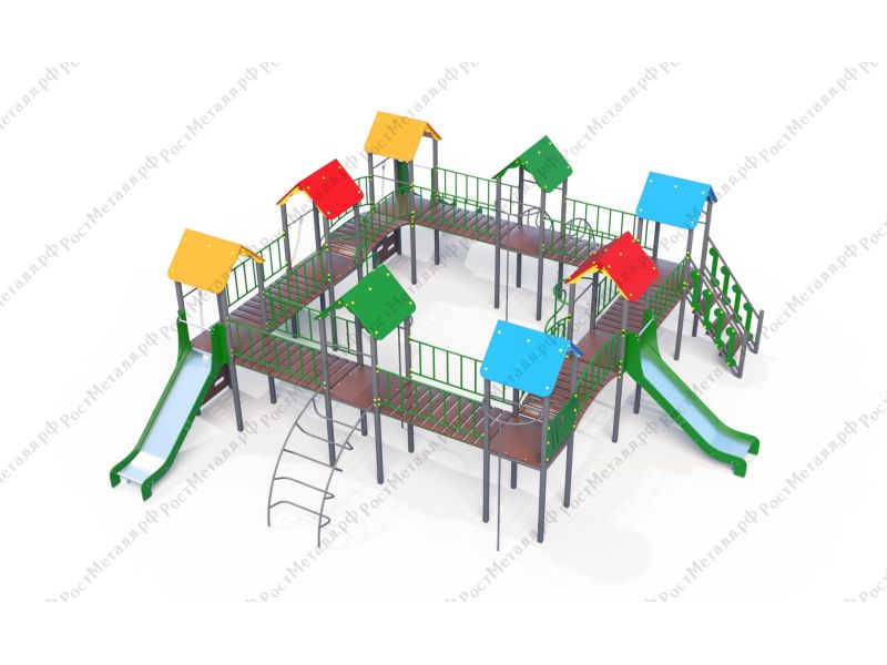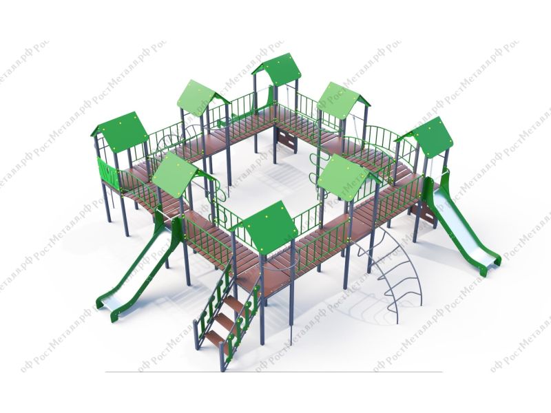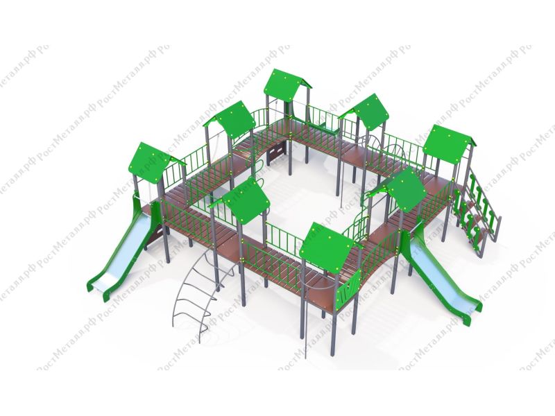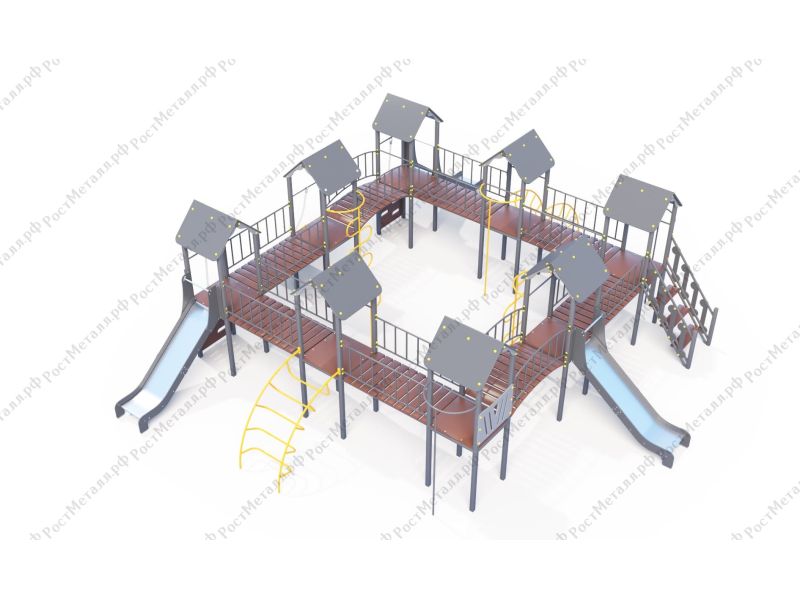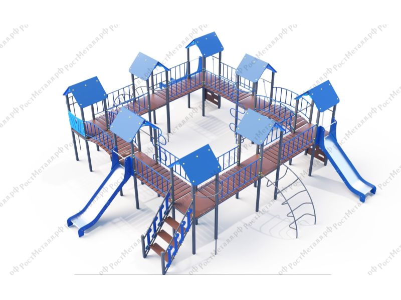 | Комплектация | 8 башен, 3 ската из нержавеющей стали, 2 лаза дуговых, 2 лестницы подъёмные, 2 качели одинарные, 2 шеста - змейки, конструкция соединена между собой мостиками-переходами прямыми и дугой. |