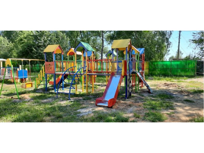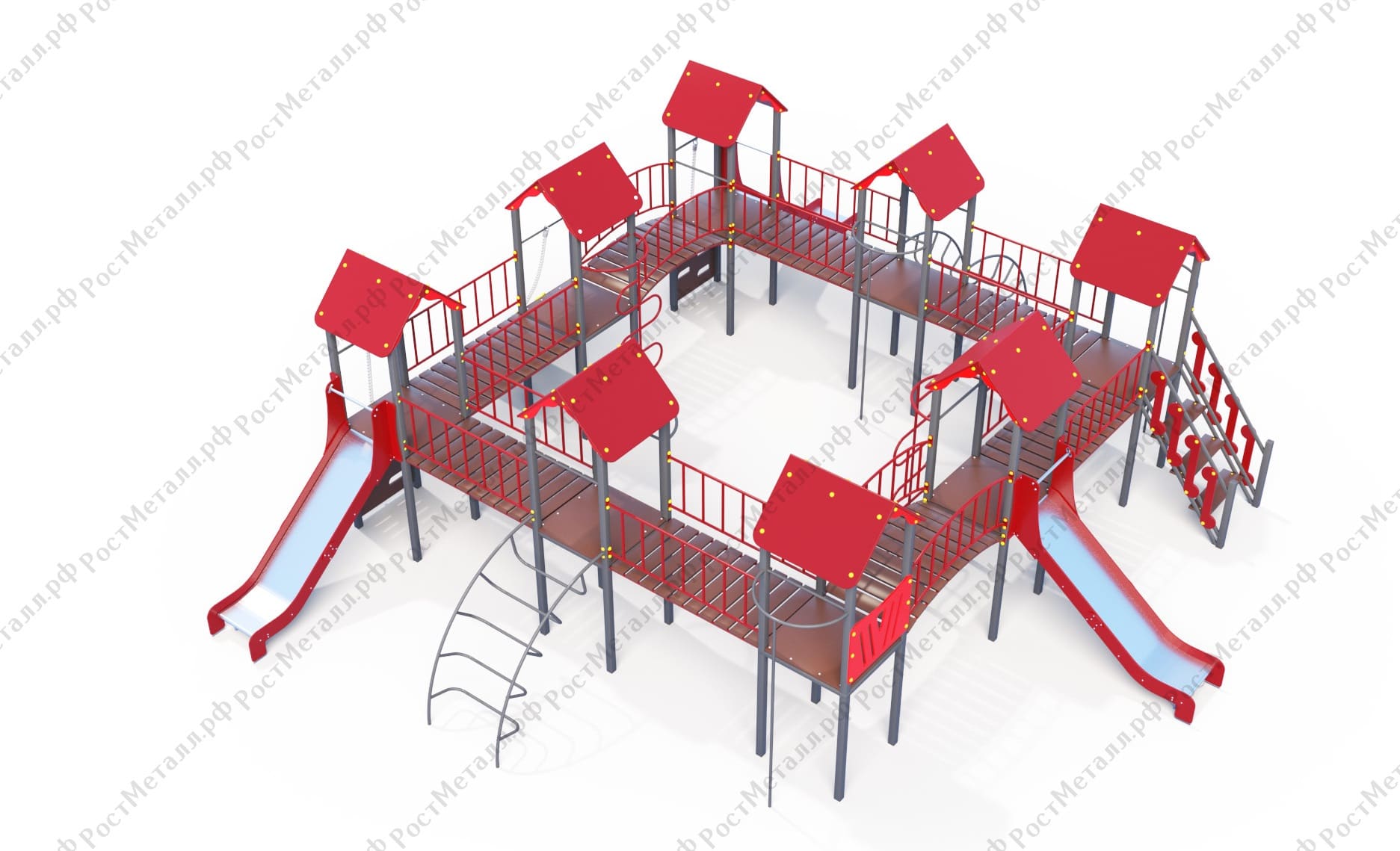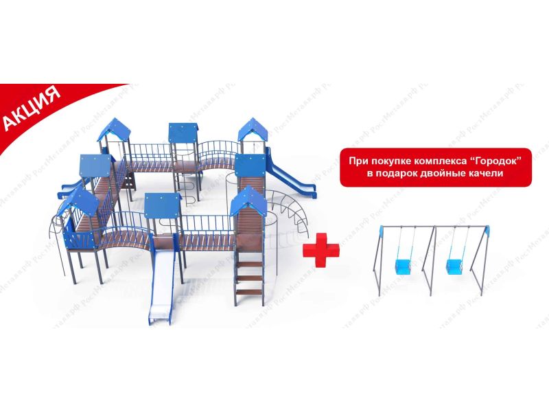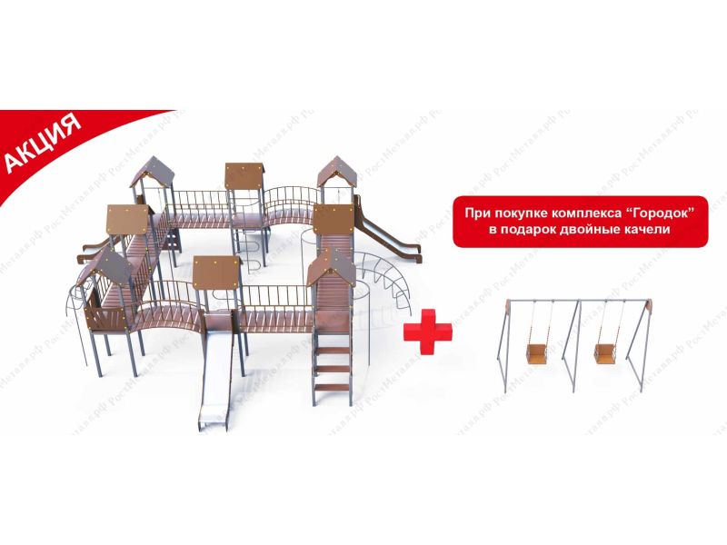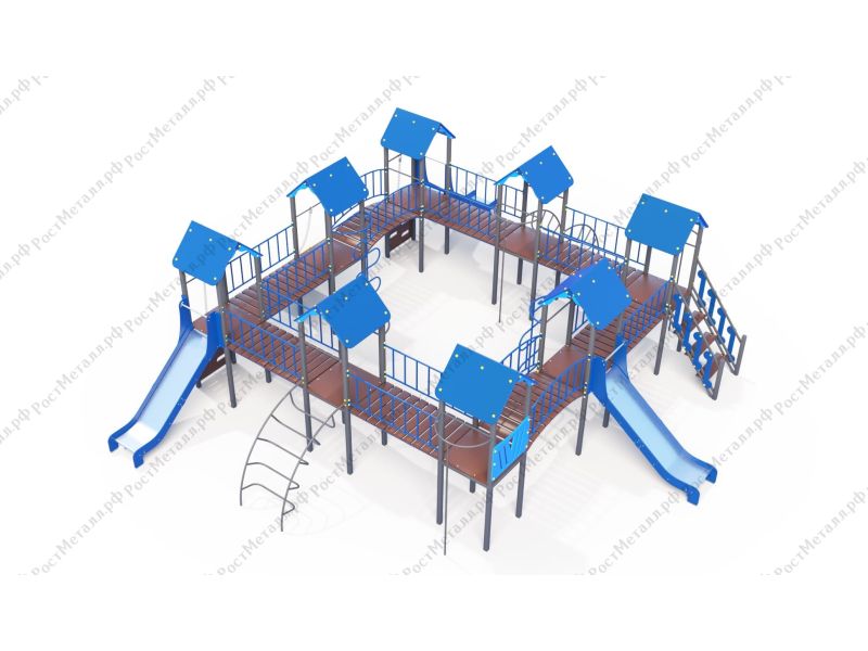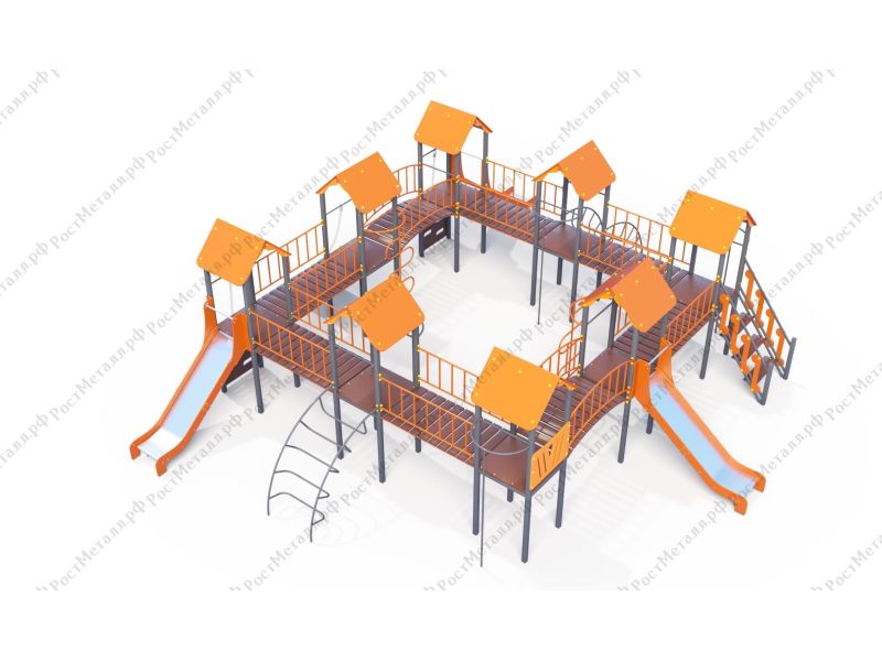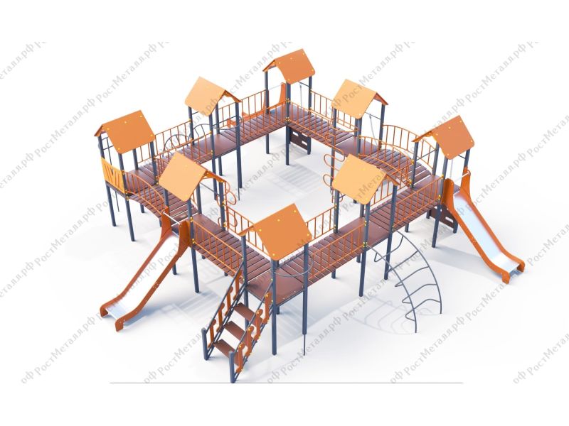 | Комплектация | 8 башен, 3 ската из нержавеющей стали, 2 лаза дуговых, 2 лестницы подъёмные, 2 качели одинарные, 2 шеста - змейки, конструкция соединена между собой мостиками-переходами прямыми и дугой. |