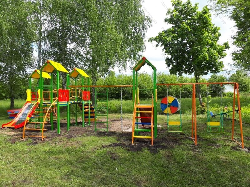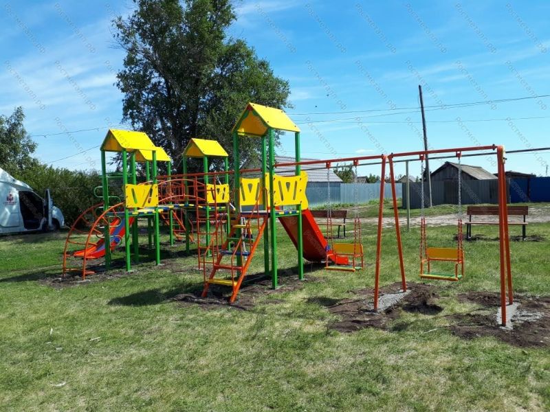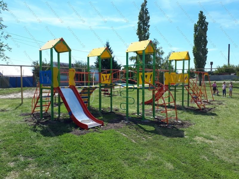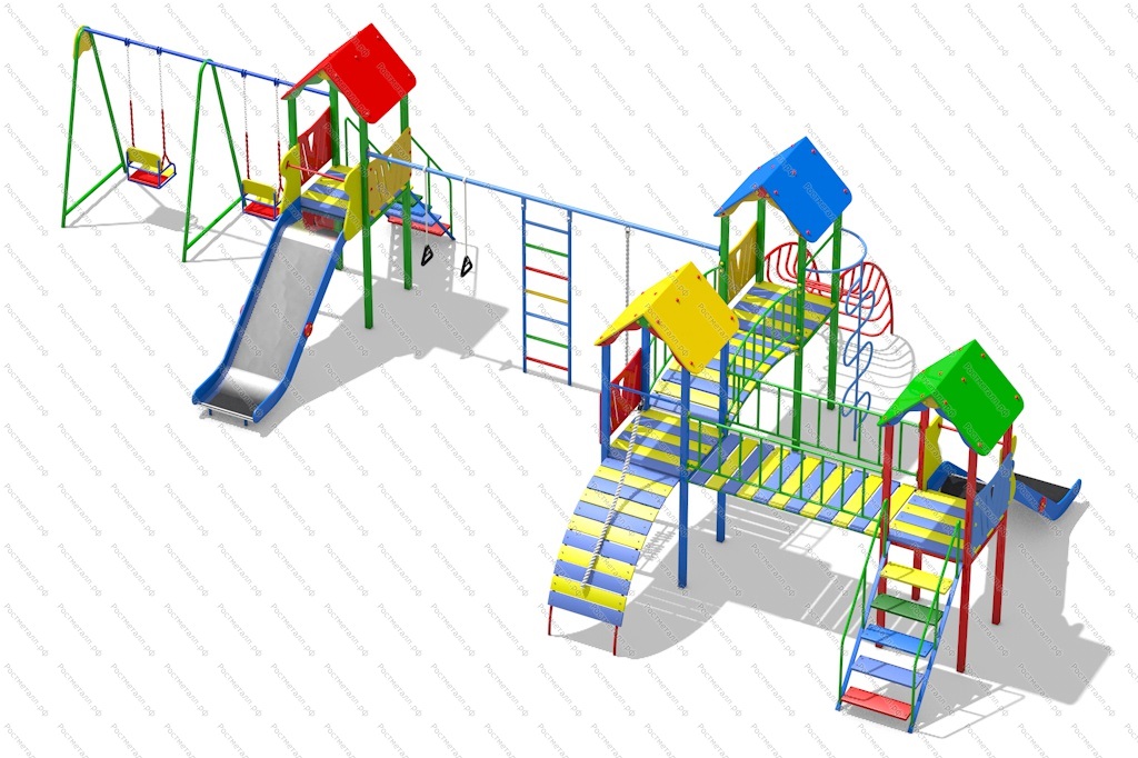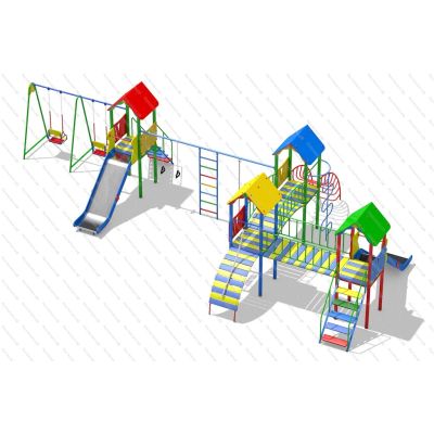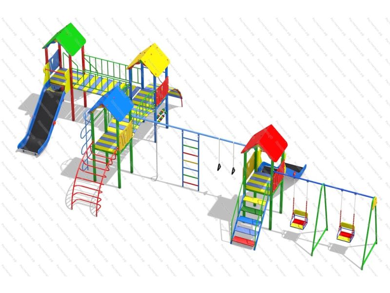 | Комплектация | 4 башни, 2 подъёмные лестницы, 2 ската из нержавеющей стали, прямой мостик, скалодром с канатом, детские счёты, мостик полукруг, шест-змейка, лаз-дуга, канат, шведская стенка, кольца гимнастические, качели двухместные. |