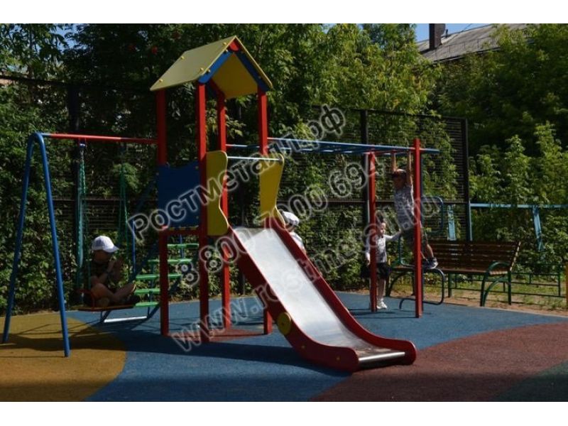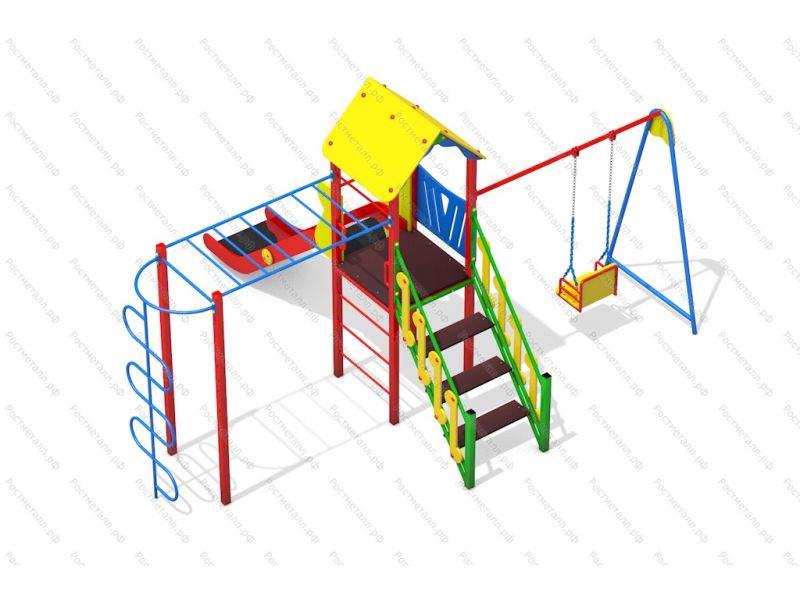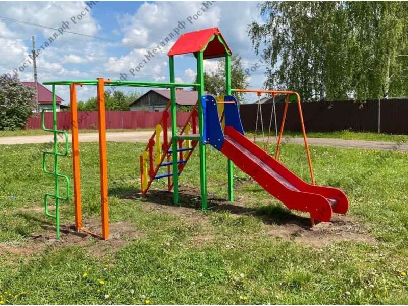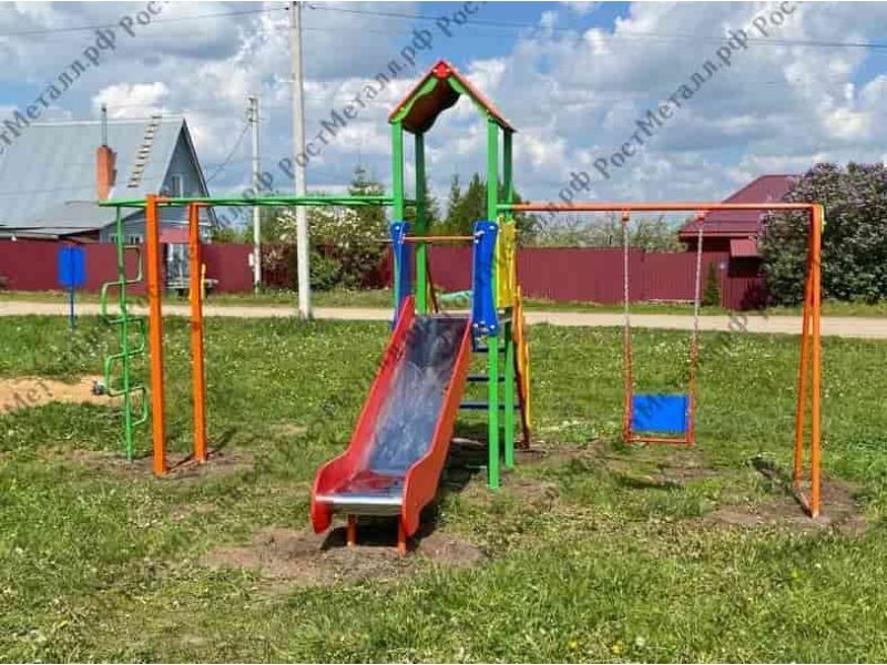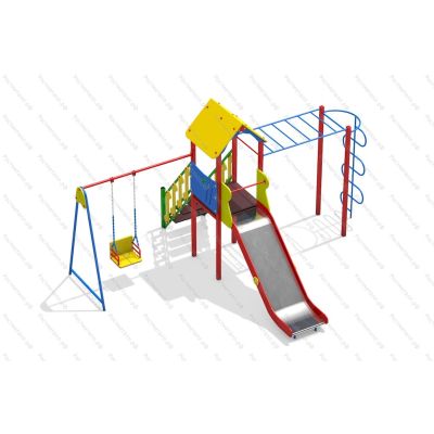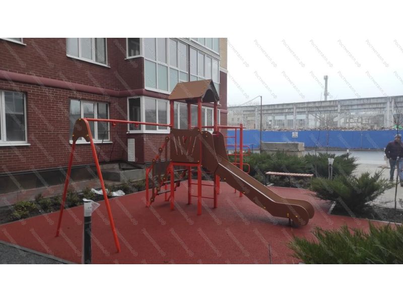 | Комплектация | Башня, лестница подъемная, скат из нержавеющей стали, качели одноместные, рукоход, шест змейка. |