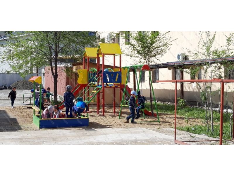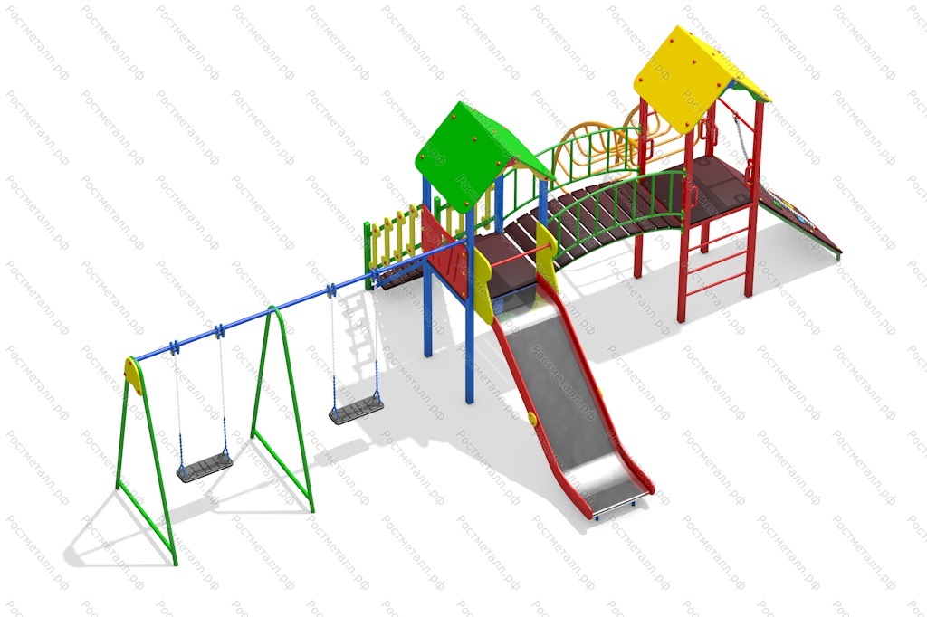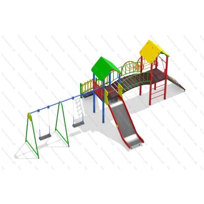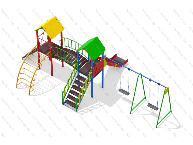 | Комплектация | 2 качели без спинки, 2 башни, лестница подъёмная, скат из нержавеющей стали, мостик арочный, лаз-дуга, скалодром с канатом. |