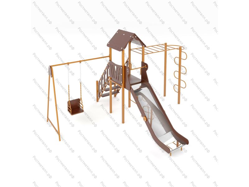 Комплектация Башня, лестница подъемная, скат из нержавеющей стали, качели одноместные, рукоход, шест змейка.