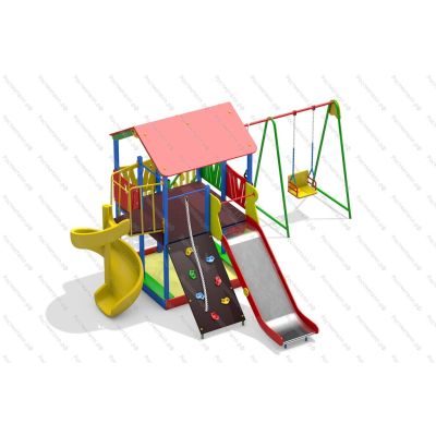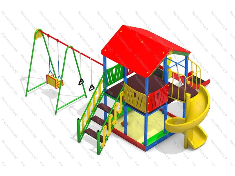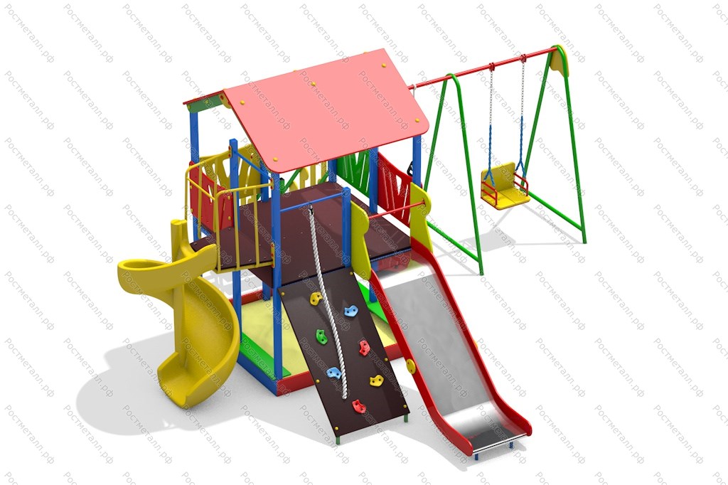 | Комплектация | Башня с балконом и песочницей, горка винтовая, лестница подъёма, качели, кольца, скаладромс канатом, горка-скат из нерж.стали |