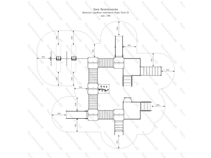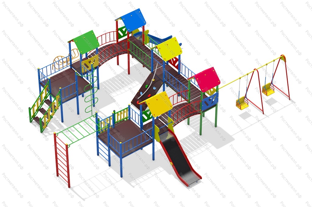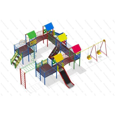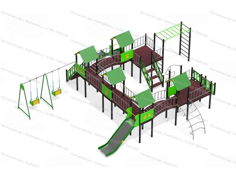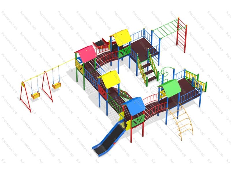 Комплектация 5 башен, 2 смотровых площадки, 2 ската из нержавеющей стали, 2 подъёмных лестницы, 2 качели, 2 прямых мостика, 2 полукруглых мостика, лаз дуга, шест змейка, скаладром с канатом, рукоход, шведская стенка.