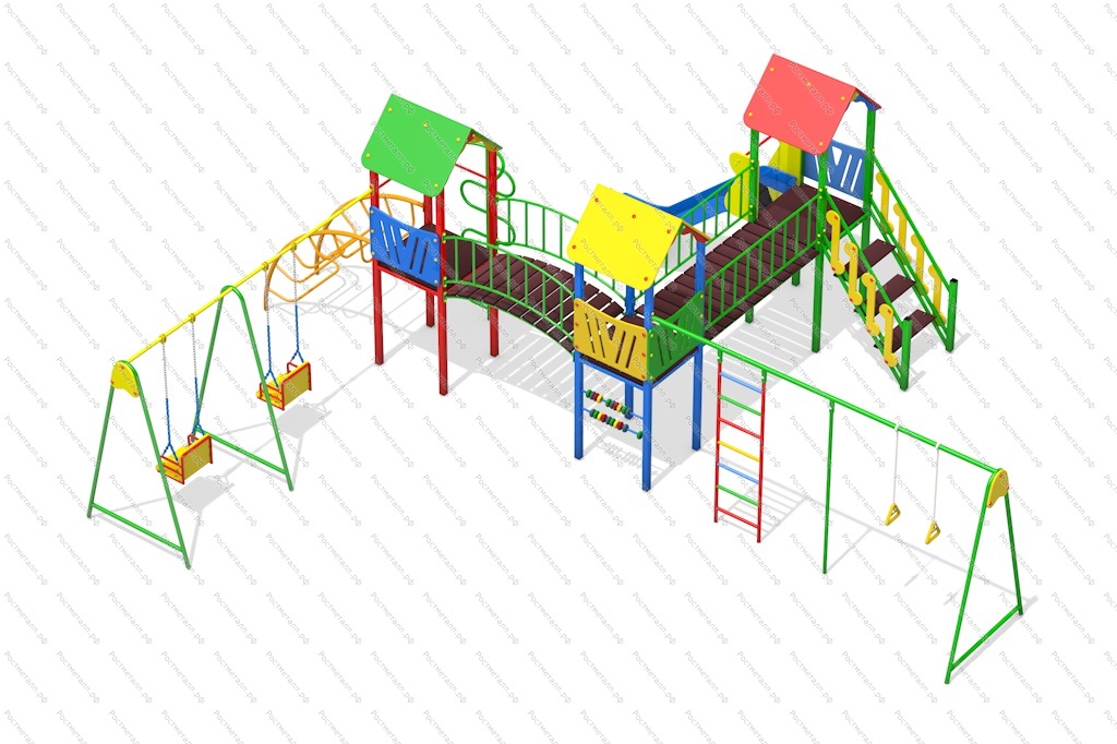| Комплектация | 3 башни, 2 качели, лаз-дуга, шест-змейка, мост-арка, шведская стенка, гимнастические кольца, прямой мост, лестница подъёмная, горка-скат из нерж.стали. |