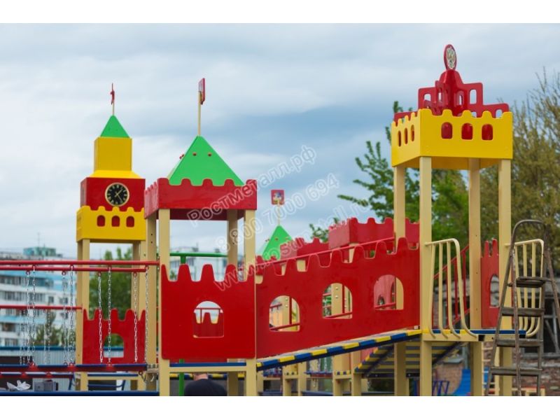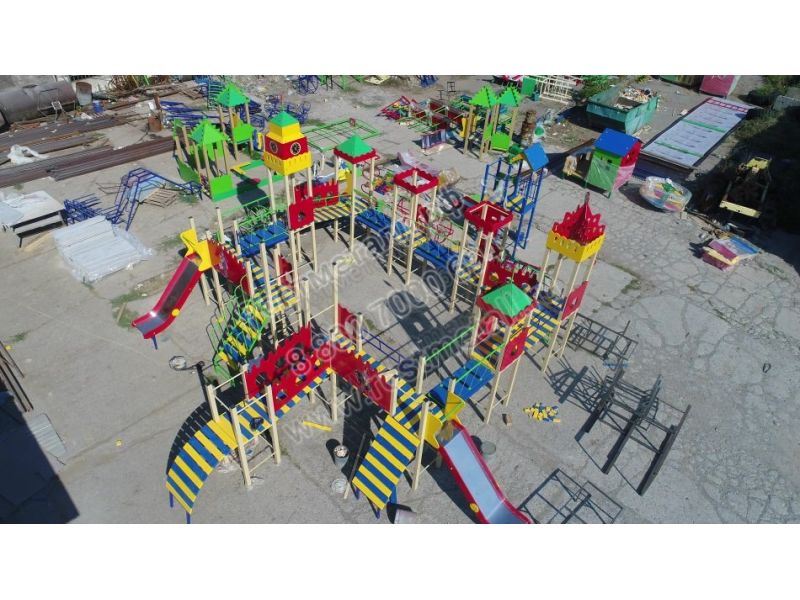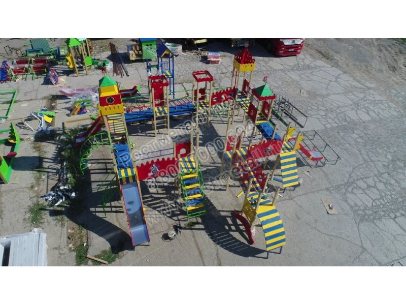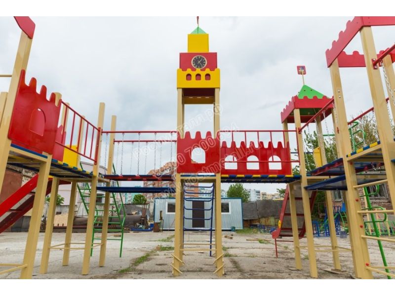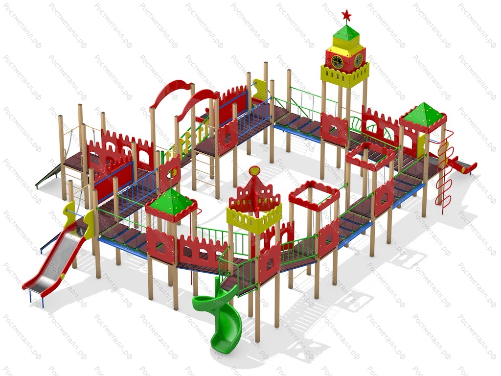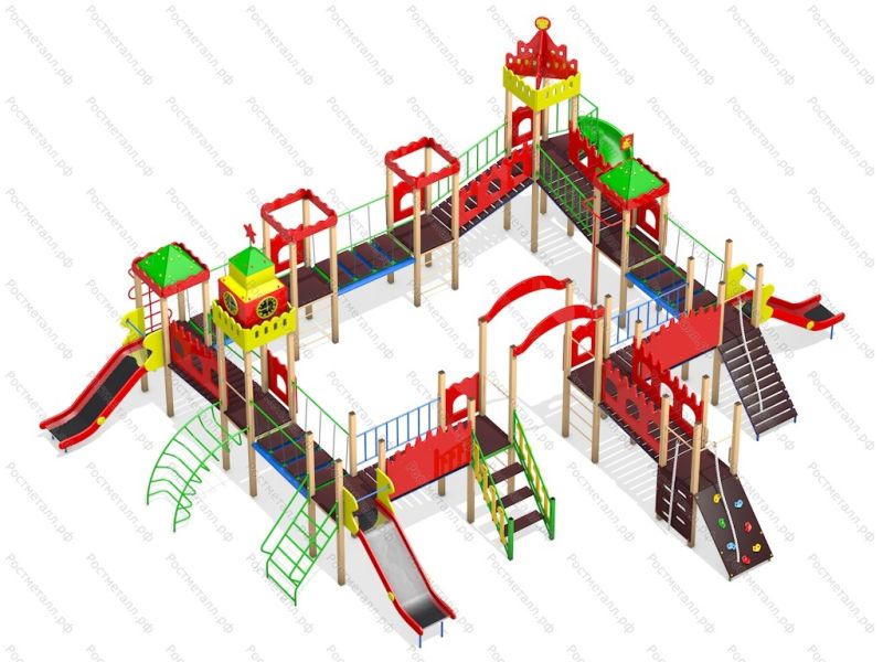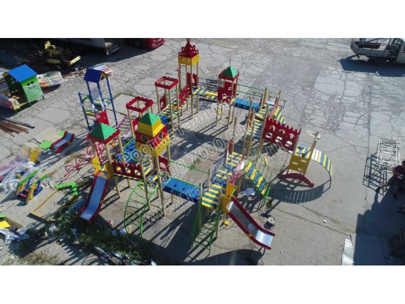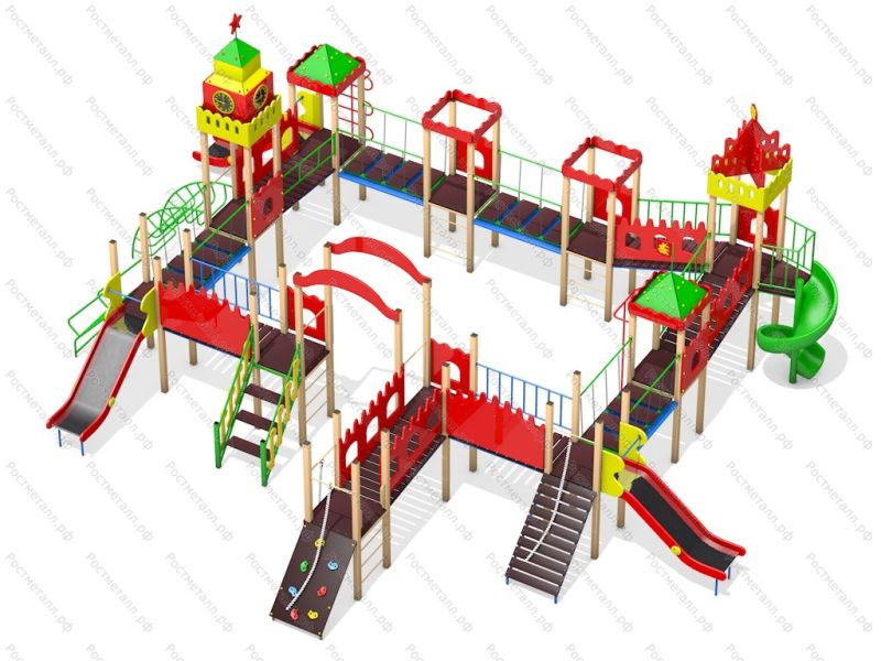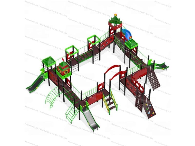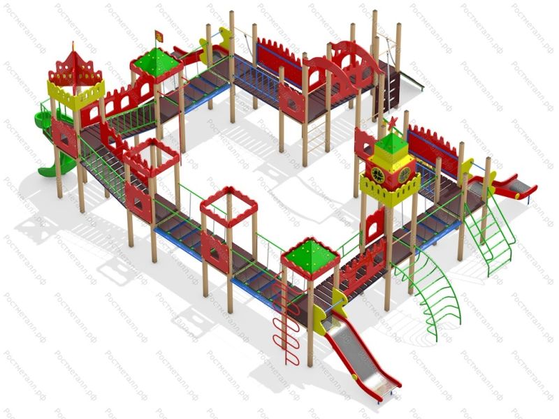 | Комплектация: | 10 башен стандарт + 1 с балконом, 3 горки-ската из нержавеющей стали, мосты: 4 подвесных, 2 наклонных, 4 прямых, шест змейка, 2 подъёмных лестницы, винтовая горка, пожарный шест, подъём с канатом: прямой и наклонный, лаз-дуга, скаладром с канатом. |
