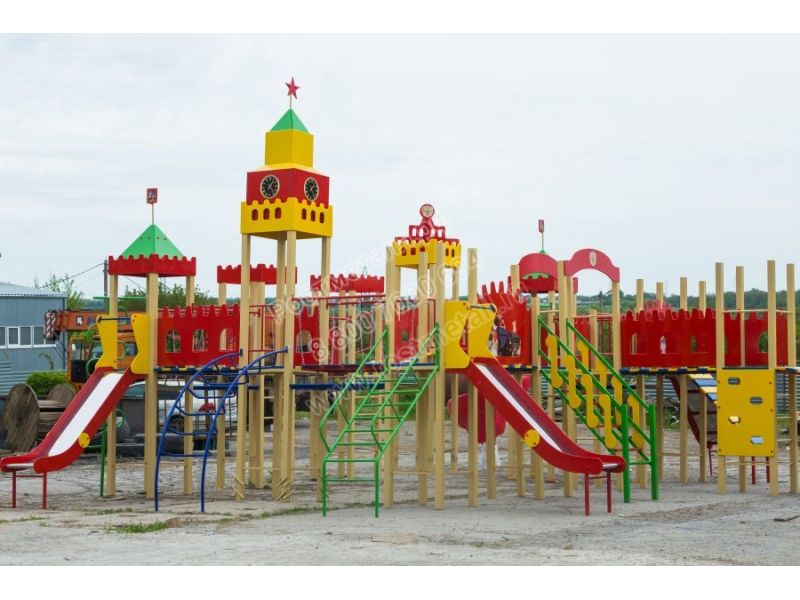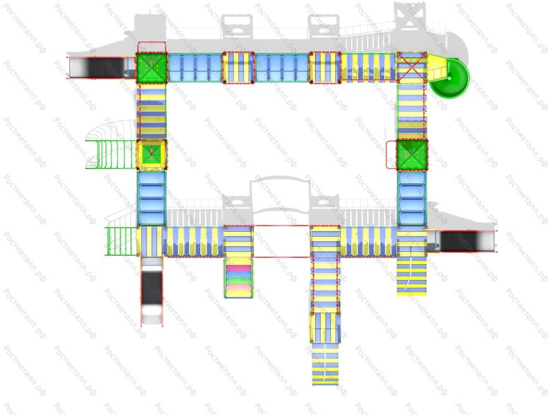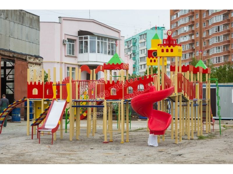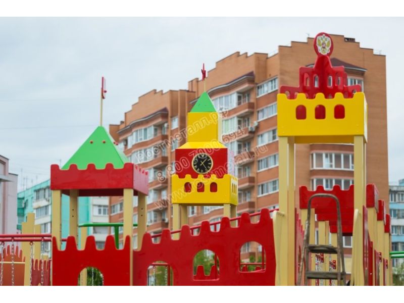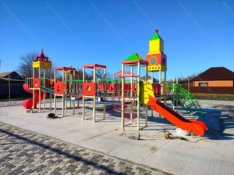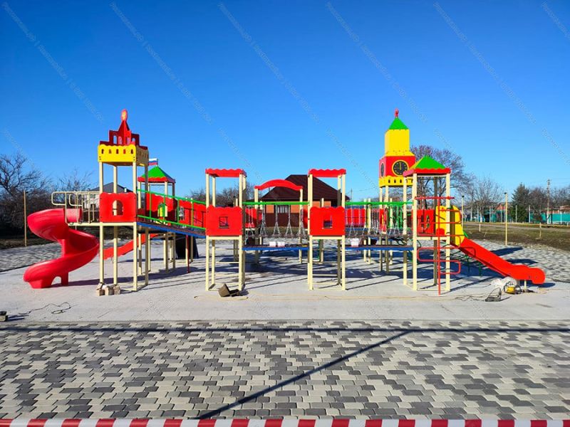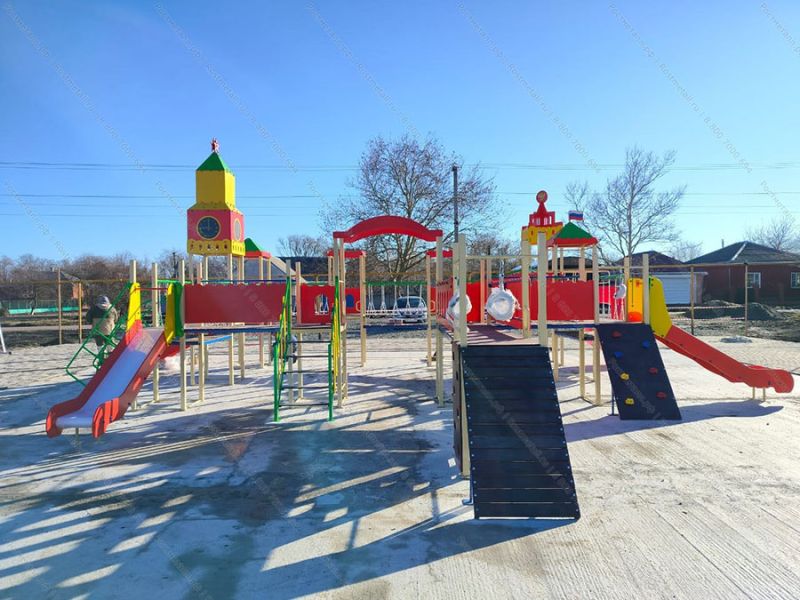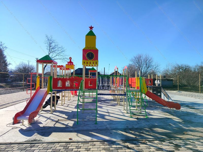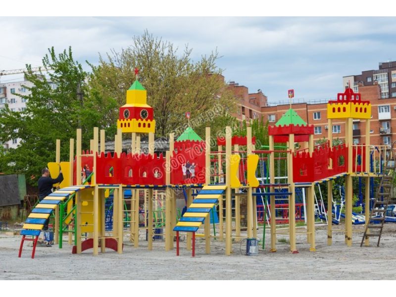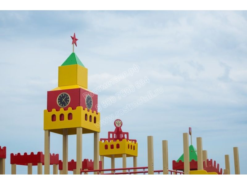 | Комплектация: | 10 башен стандарт + 1 с балконом, 3 горки-ската из нержавеющей стали, мосты: 4 подвесных, 2 наклонных, 4 прямых, шест змейка, 2 подъёмных лестницы, винтовая горка, пожарный шест, подъём с канатом: прямой и наклонный, лаз-дуга, скаладром с канатом. |