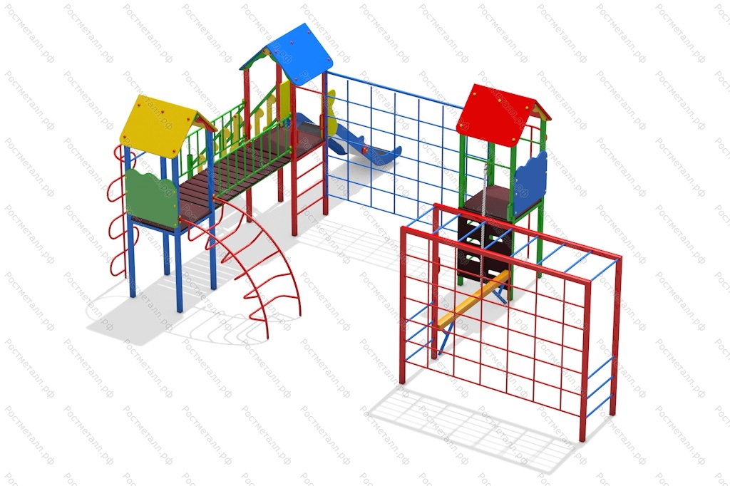 | Комплектация | 3 башни, шест змейка, лаз дуга, мост прямой, лестница подъёмная, скат из нержавейки, 2 лаза сетка-переход, подъёмник с канатом, пожарный шест, гимнастическое бревно, рукоход. |