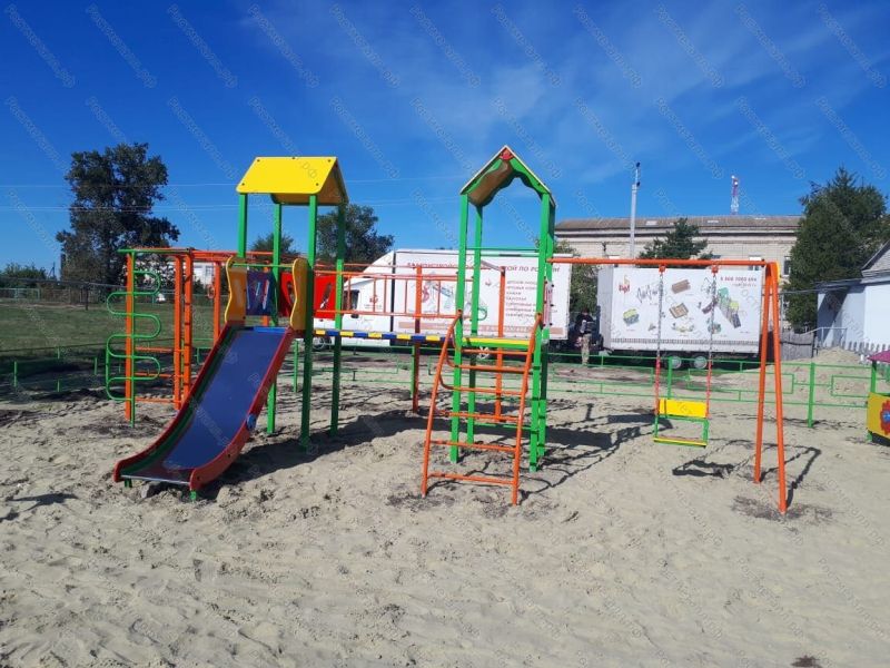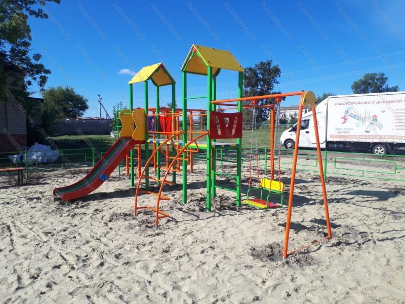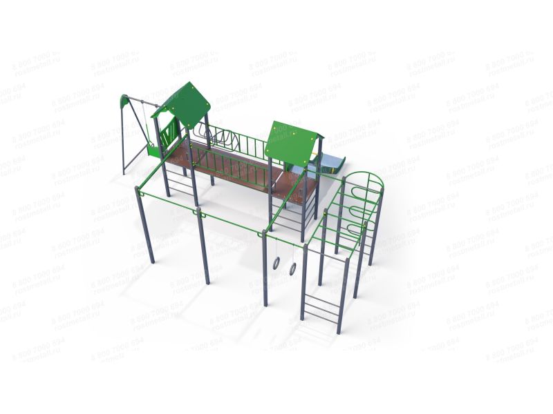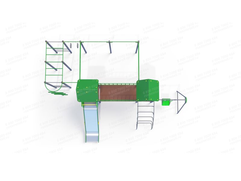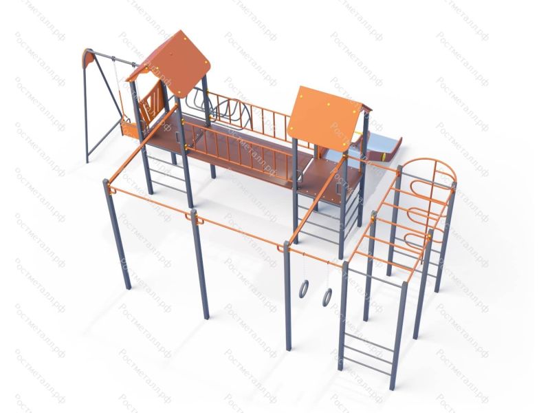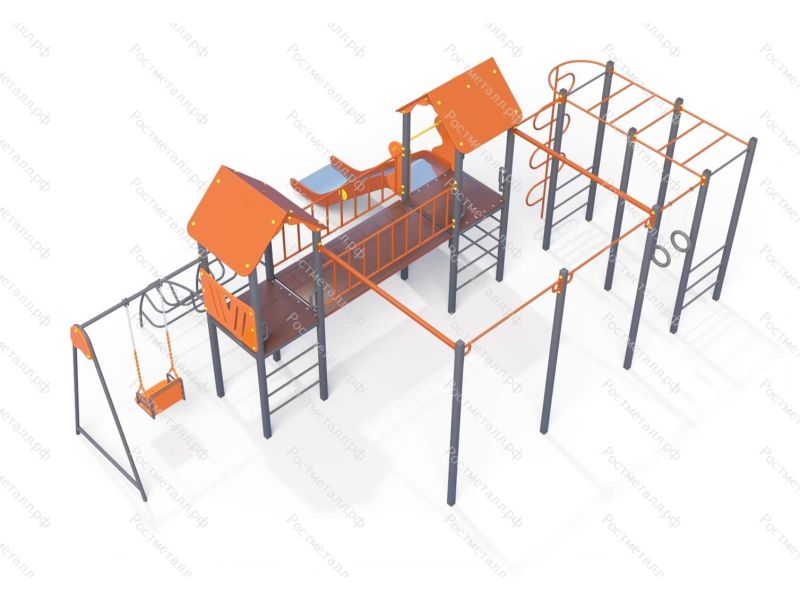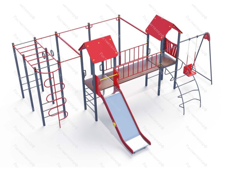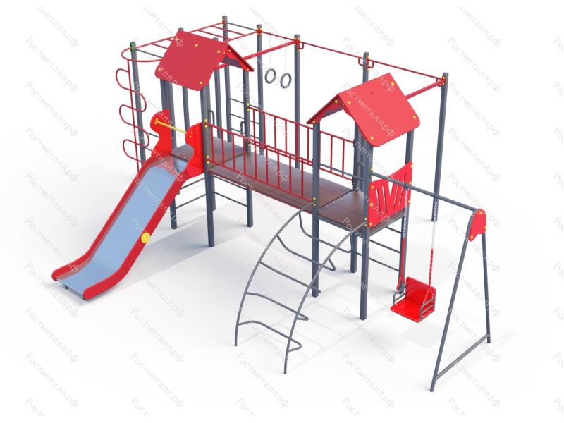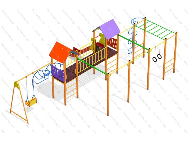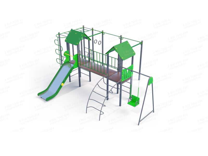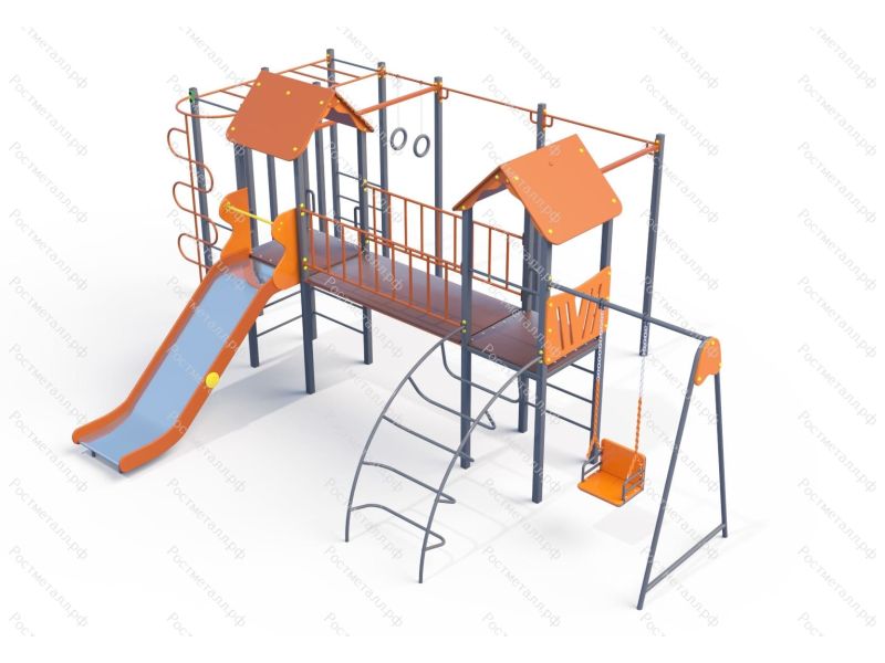 | Комплектация | 2 башни, мостик, скат из нержавейки, лаз дуга, качели, 2 турника, кольца гимнаст., рукоход, шест-змейка. |