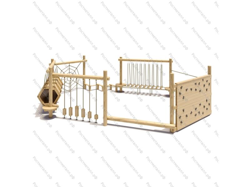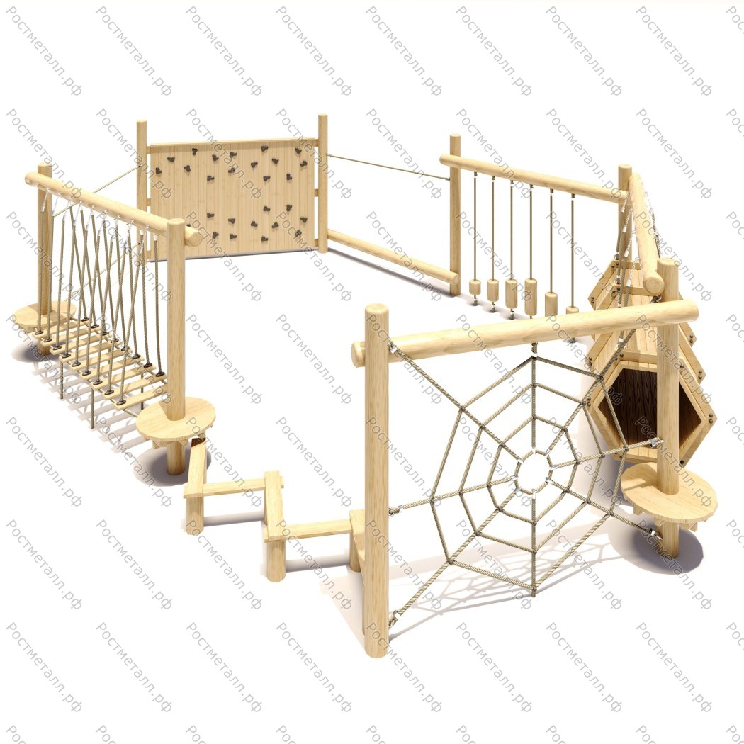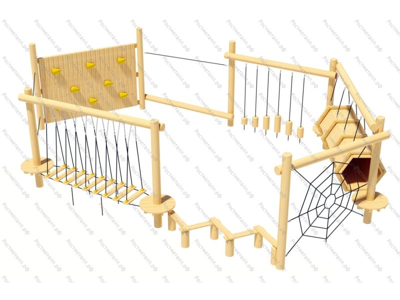 Комплектация  Забор, гимнаст. бревно, подвесной тоннель, канатная переправа со ступенями, лаз-паутинка, шагоход, подвесной мост.