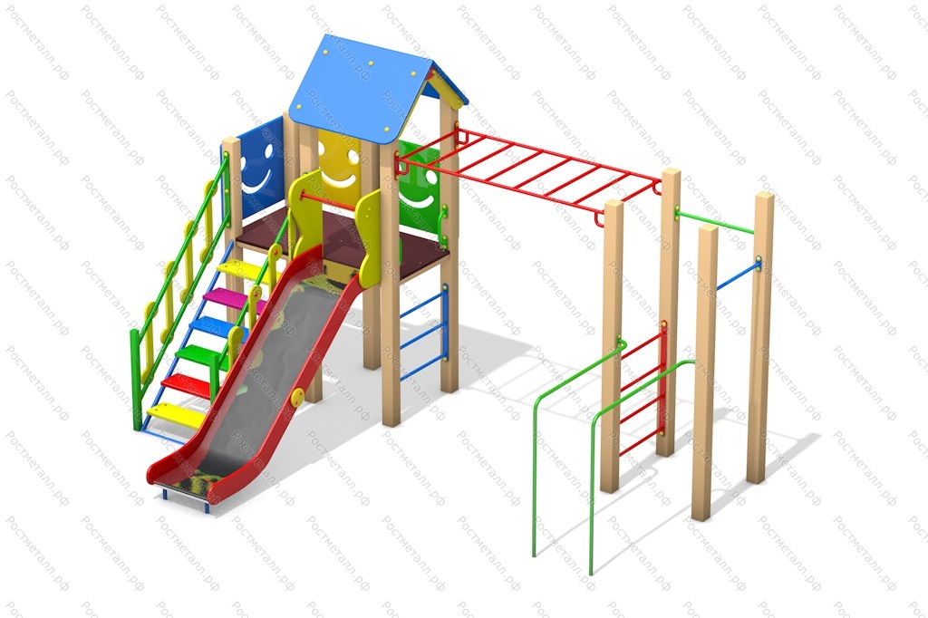 | Комплектация | Башня, подъёмная лестница, скат из нержавеющей стали, рукоход, шведская стенка, брусья, турник. |