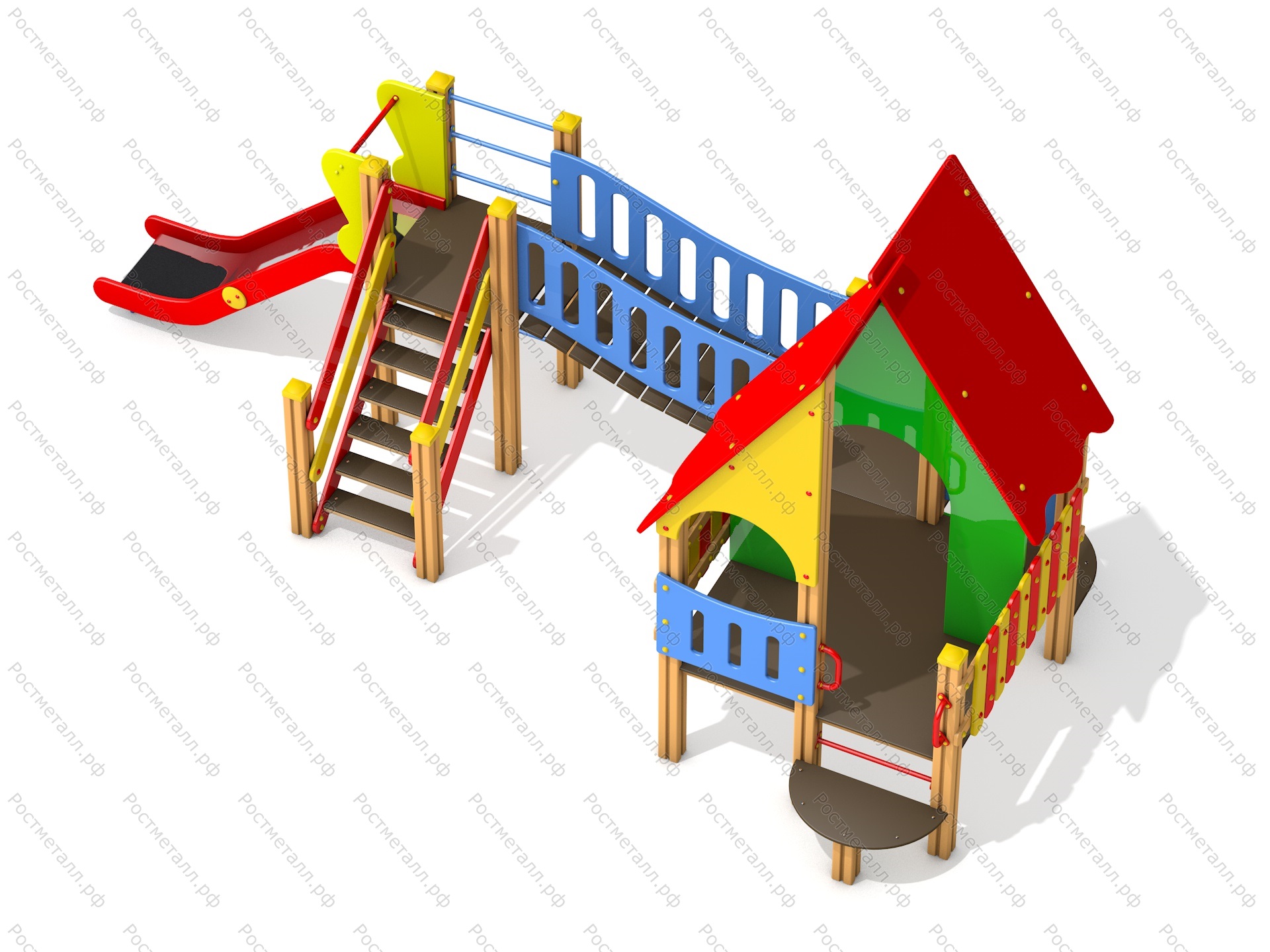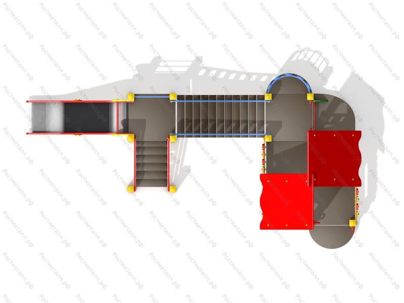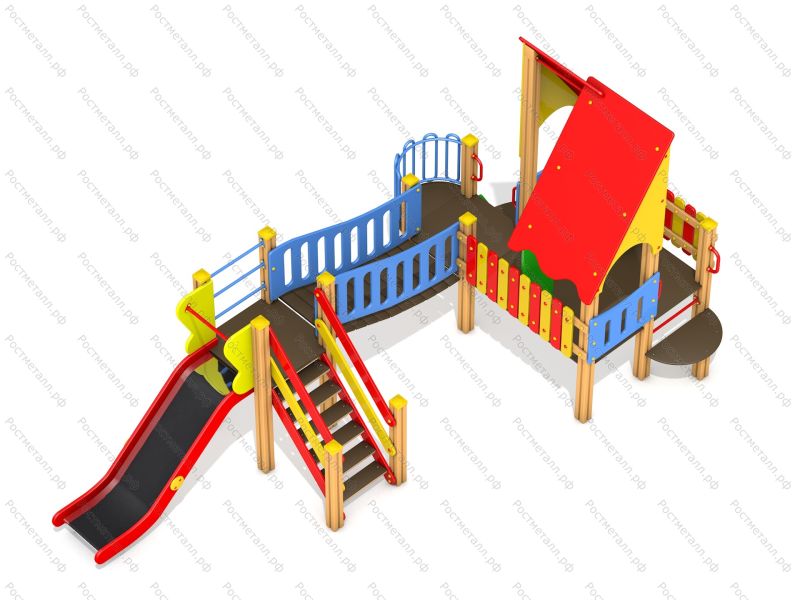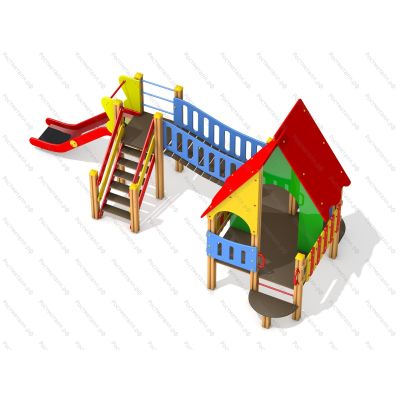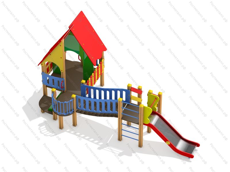 | Комплектация | Башня, горка-скат из нерж. стали (посадочная высота 0,9м), лестница подъёма, изогнутый мост, большая башня с балконом (посадочная высота 0,6м), шведская стенка. |