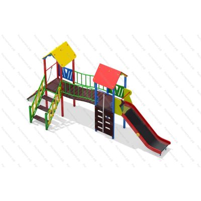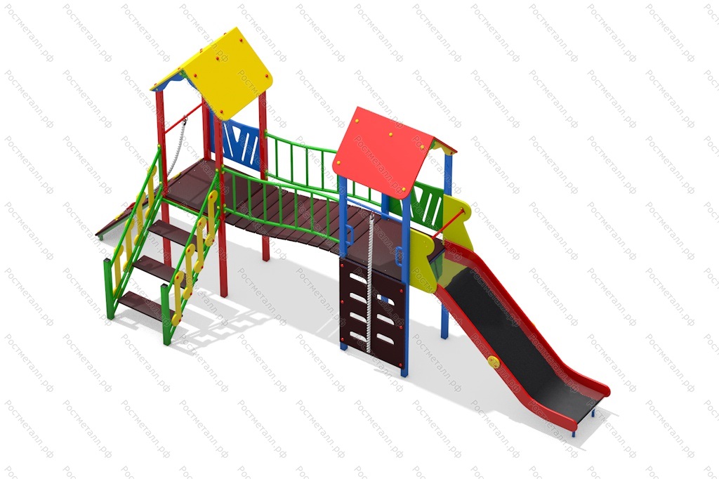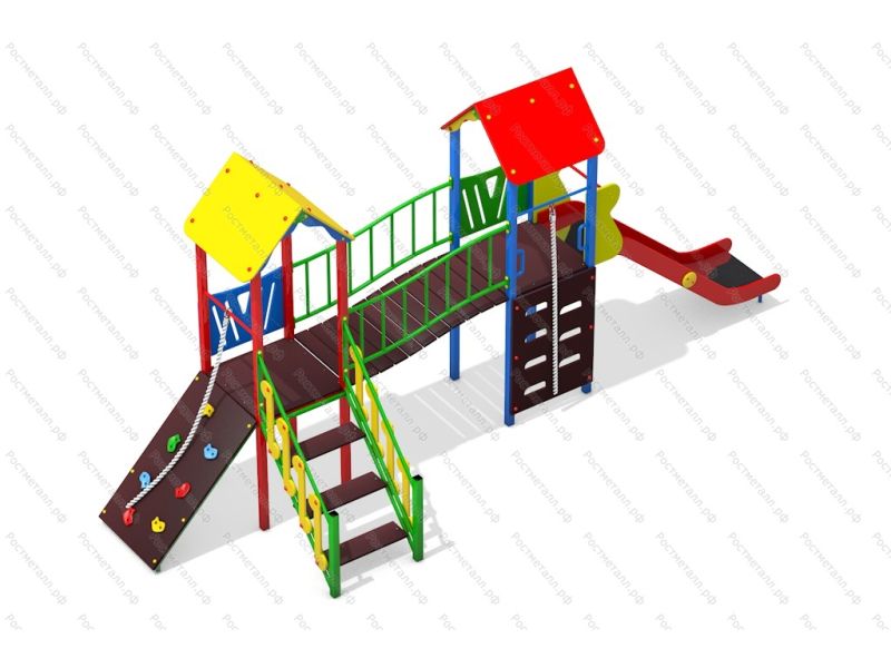 Комплектация Башня 2 шт, скат из нержавеющей стали, подъёмная лестница, скалодром с канатом, подъёмник с канатом, мост.