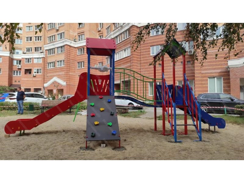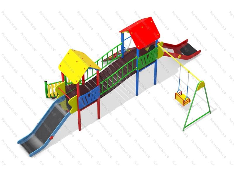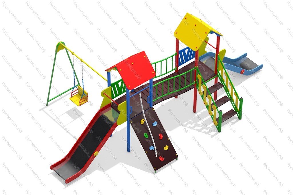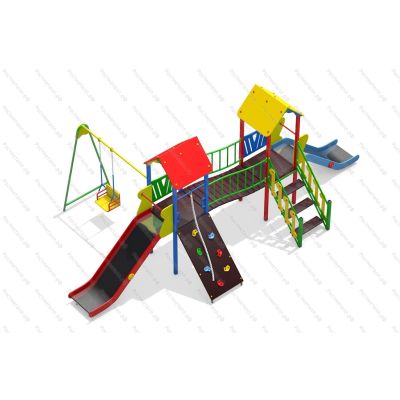 | Комплектация | 2 башни, 2 ската из нержавеющей стали, качели одноместные, подъёмная лестница, скалодром с канатом, изогнутый мостик. |