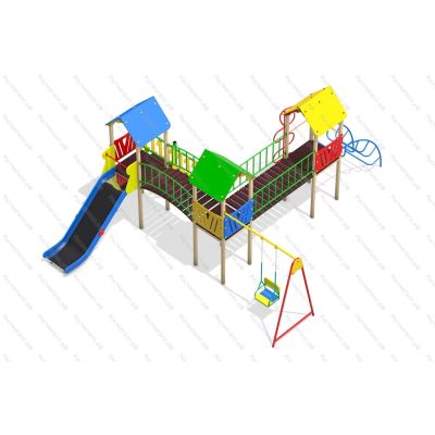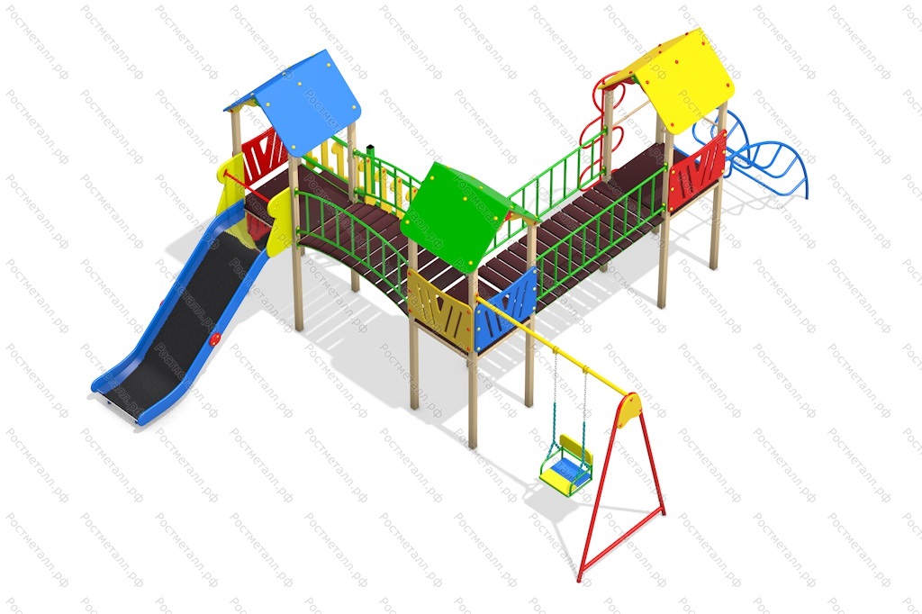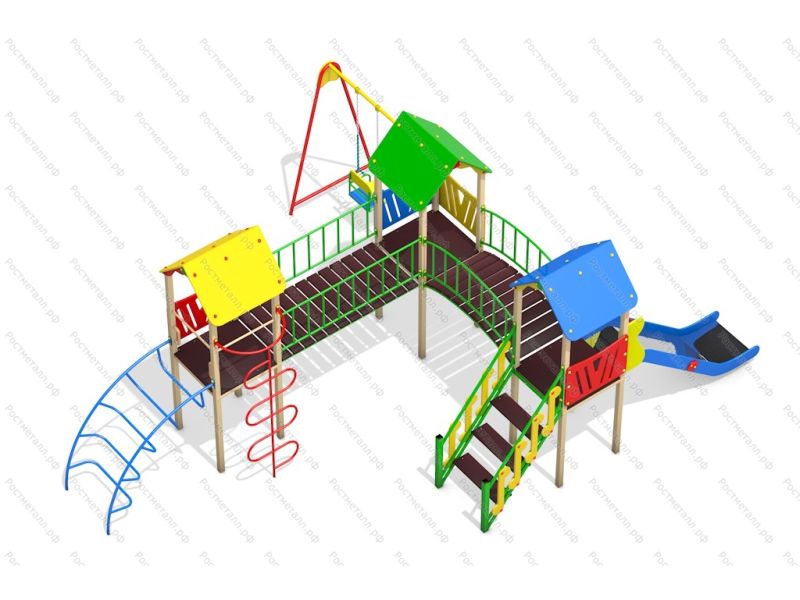 | Комплектация | 3 башни, лаз-дуга, шест-змейка, прямой мост, качели, мост-полукруг, скат из нерж., лестница подъёмная. | ||||||
