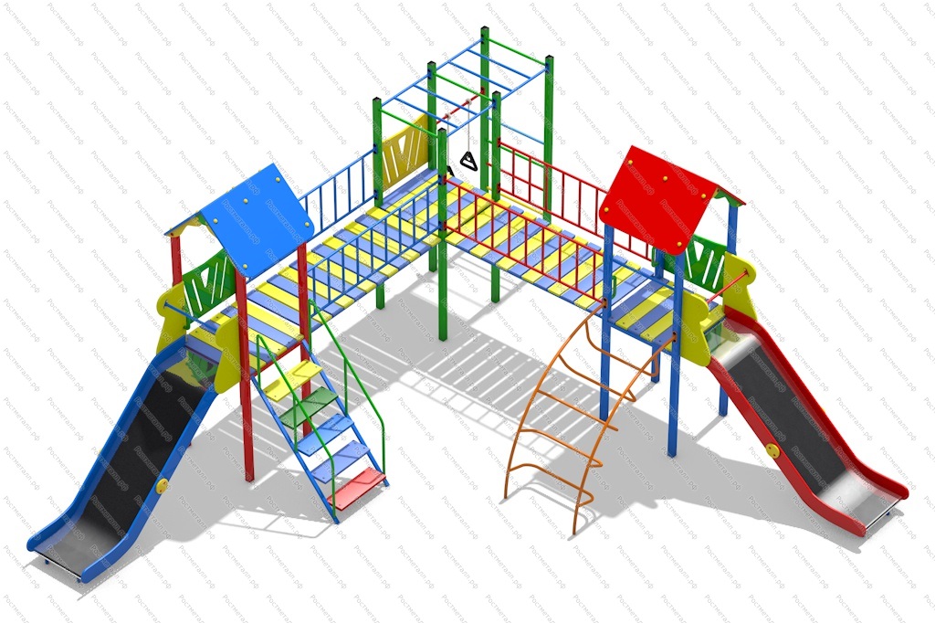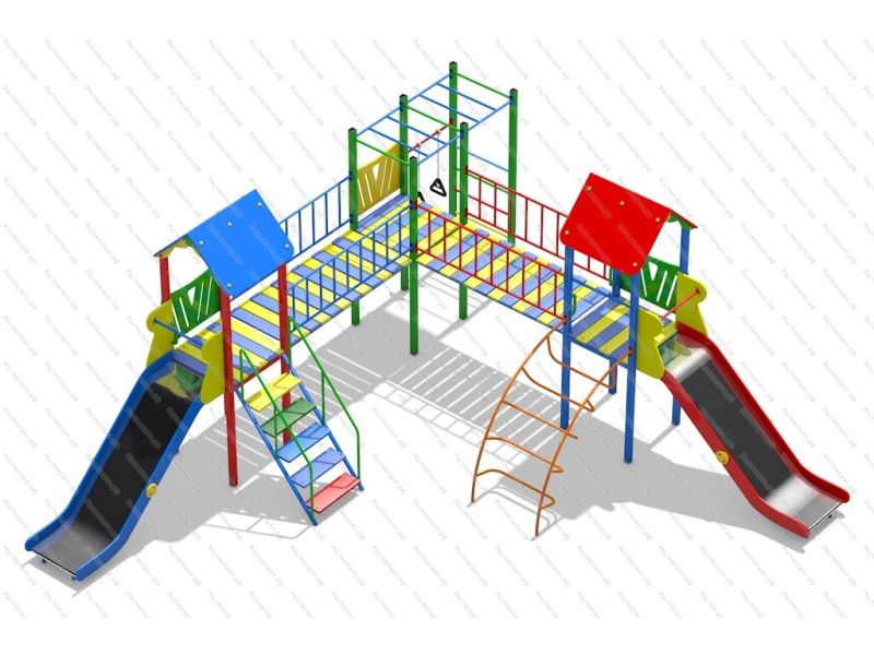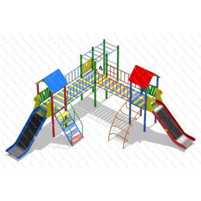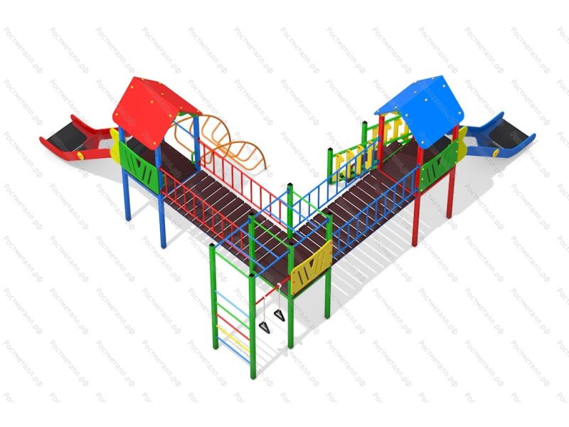 | Комплектация | 3 башни, 2 ската из нержавеющей стали, лаз дуга, лестница подъёмная, 2 прямых мостика, рукоход, кольца гимнастические. |
