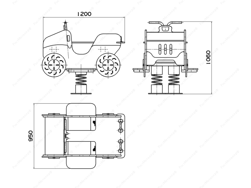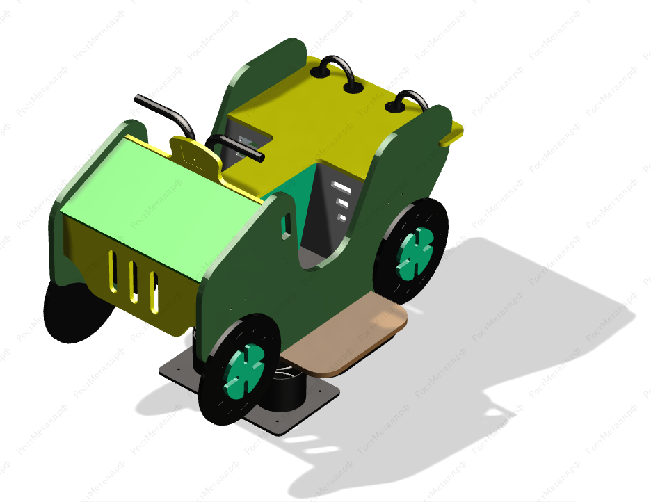 Опора выполнена из листа δ = 4 мм методом холодного прессования и соединена с пружиной в нижней её части при помощи металлического диска болтовым соединением. Опорная плита выполнена из листа толщиной δ = 4 мм и выполняет роль фундамента. Опора и опорная плита соединены между собой при помощи раскосов на болтовых соединениях. Корпус в виде квадроцикла, опоры для ног, пол, сиденье со спинкой, декоративные элементы должны быть выполнены из влагостойкой фанеры толщиной не менее 15 мм. Поручни должны быть выполнены из металлической трубы диаметром не менее 21 мм. Перекладины жесткости должны быть выполнены из металлической трубы диаметром не менее 26 мм. |
