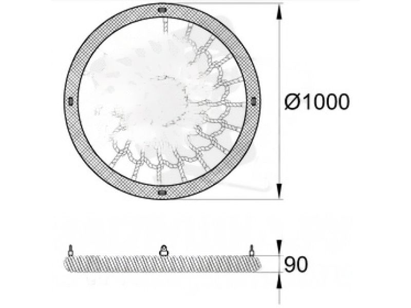 Сиденье состоит из стальной рамы в обмотке из 3-прядного каната диаметром 19мм, сетка - из 4-прядного армированного каната диаметром 16мм. Максимальная нагрузка на качели — 250 кг. В комплект поставки входит сиденье и подвесы.