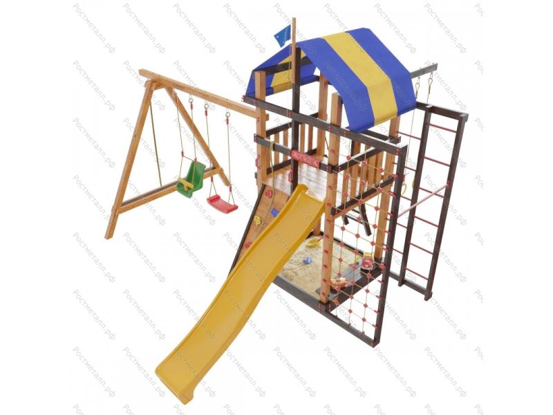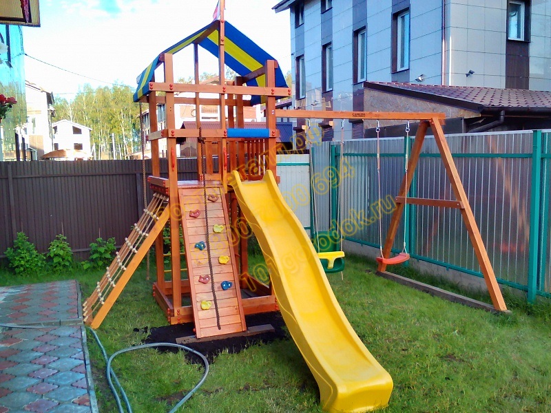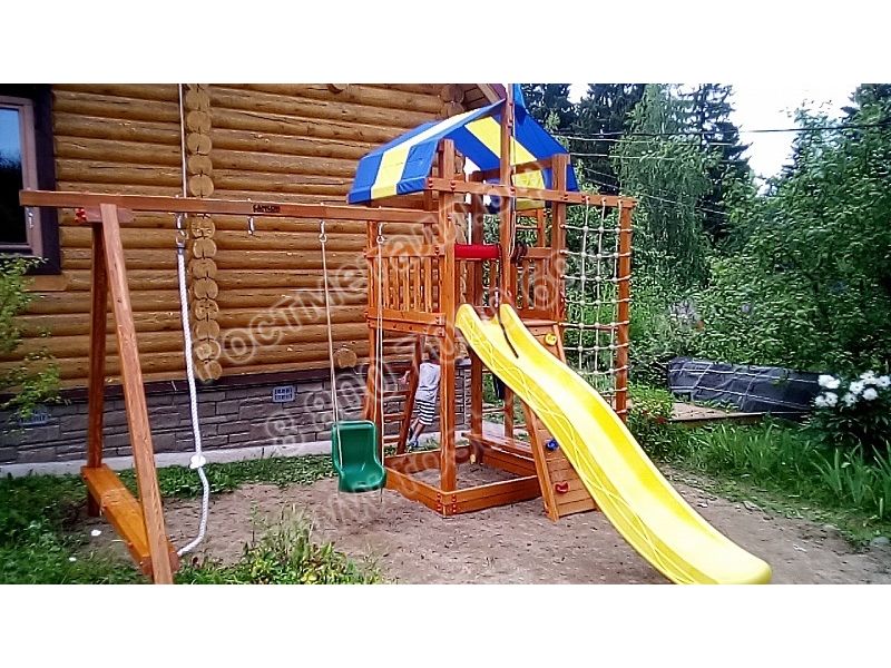 Товар поставляется в разобранном виде. В комплект для самостоятельной сборки входит подробная инструкция по сборке. Товар упакован в гофрокартонные короба в количестве: 7 мест + горка + качели со спинкой. Установка детской игровой площадки проводится на ровной поверхности, свободной от насаждений. Размер площадки не менее 5,8м х 7,1м. Рекомендуем зафиксировать конструкцию используя анкера любой формы.