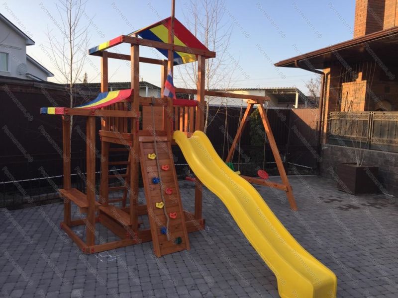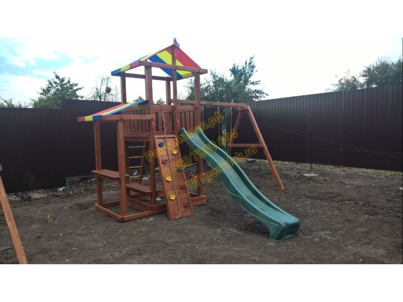 Товар поставляется в разобранном виде. В комплект для самостоятельной сборки входит подробная инструкция по сборке товара. Товар упакован в гофрокартонные короба в количестве: 8 мест + горка + качели со спинкой + борт "Мэйджик" малый. Установка детской игровой площадки проводится на ровной поверхности, свободной от насаждений. Размер площадки не менее 5,8м х 7,1м. Рекомендуем зафиксировать конструкцию используя анкера любой формы. Покрытие: 3 слоя защитного покрытия!