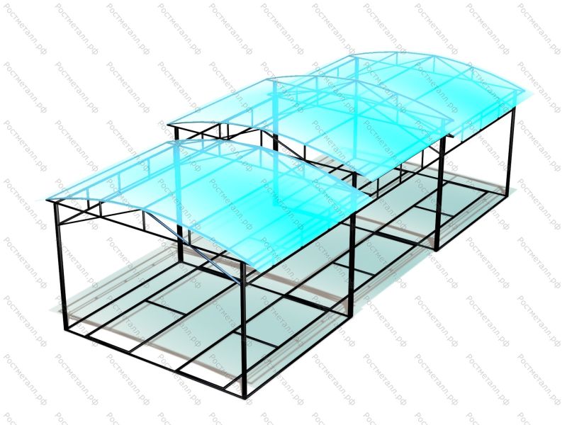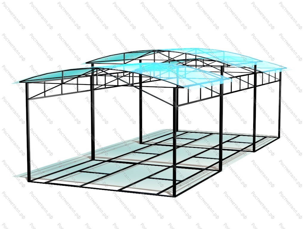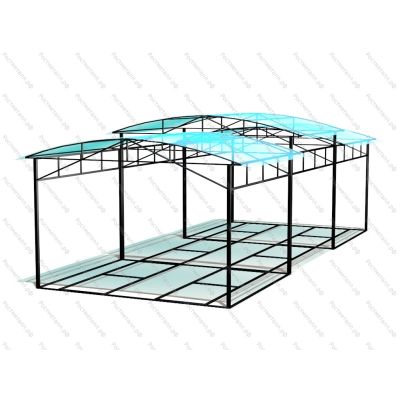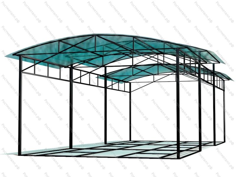 Профильная труба стоек 100х100 мм, крыша 50х25 мм, глубина бетонирования - 700 мм, при длине 10 м и 12 м - 14 стоек. Навес монтируется на раме и устанавливается на бетонное или асфальтное покрытие.
